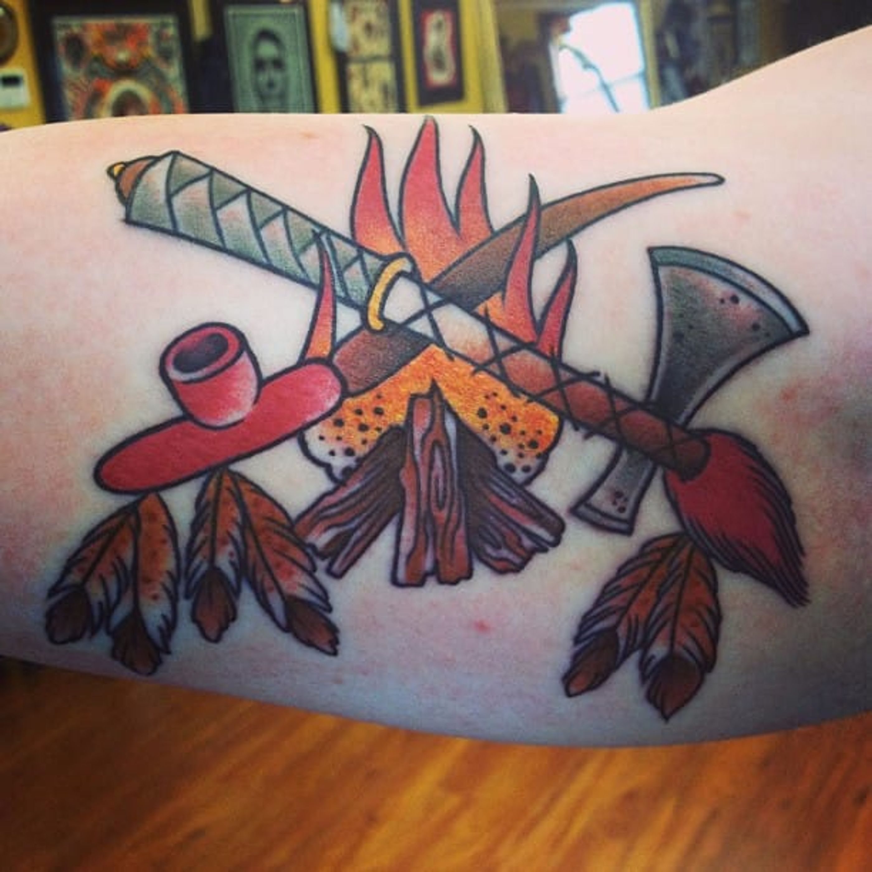 Peace Pipe Tattoo, artist unknown #peacepipe #pipe #smoke #feathers #fire #NativeAmericaTattoo #traditional
