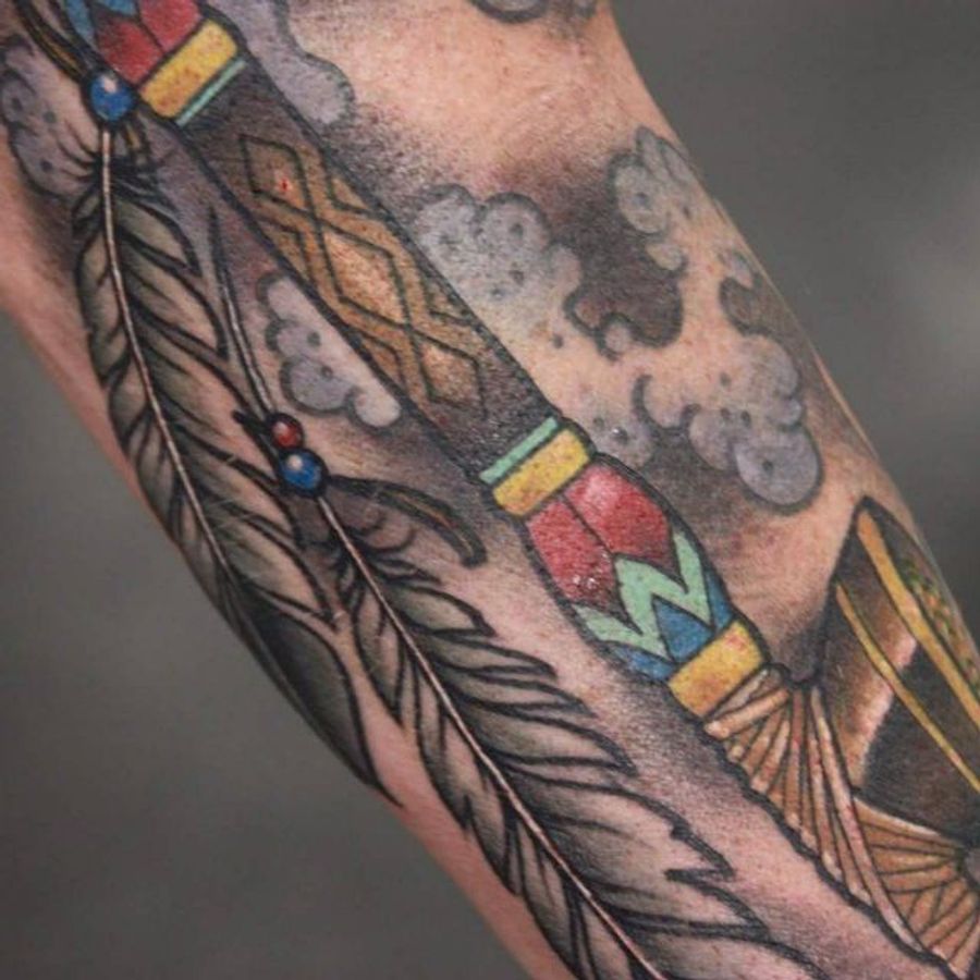 Peace Pipe Tattoo by Chris Libby #peacepipe #pipe #smoke #feathers #NativeAmericaTattoo #traditional #ChrisLibby