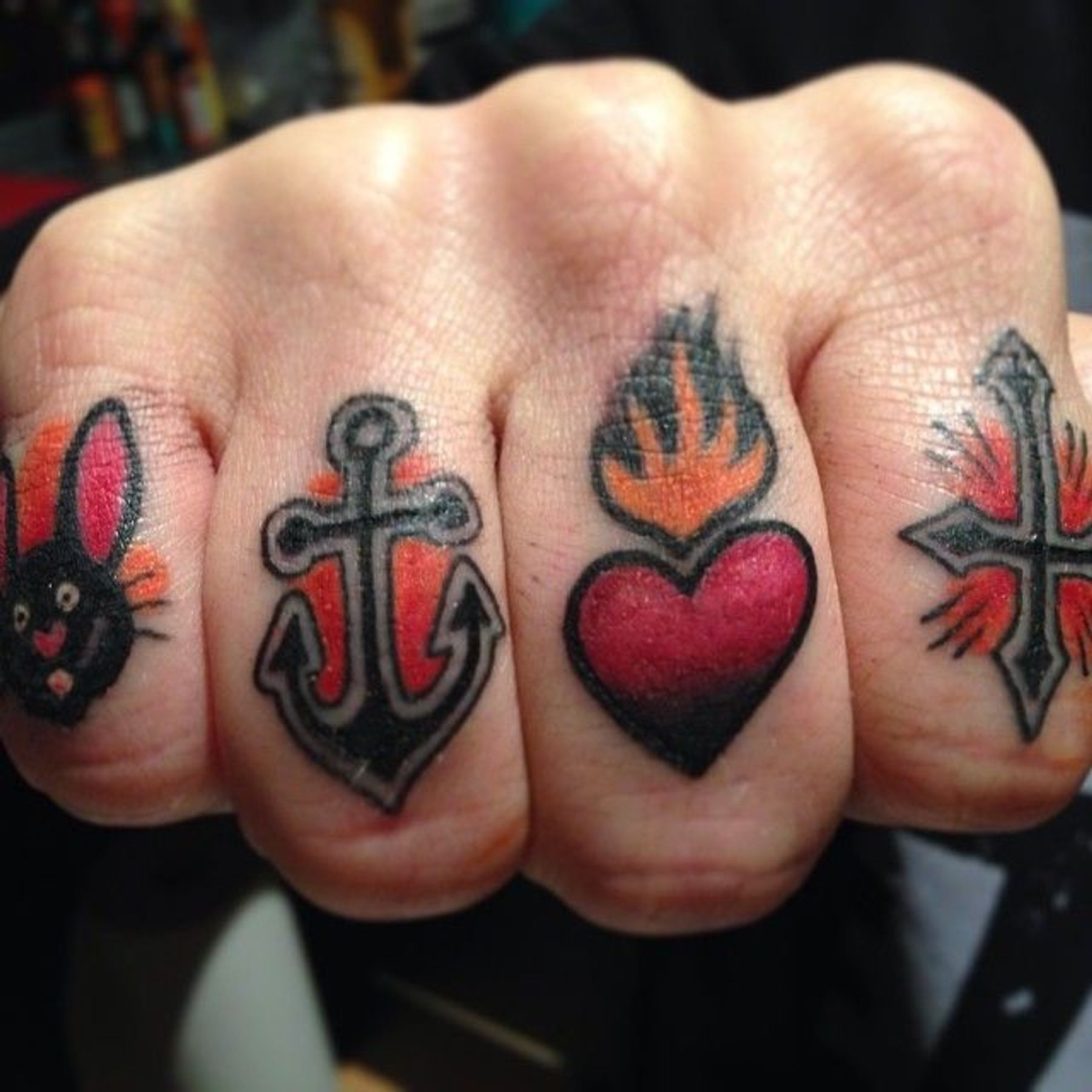 #fingertattoo #anchor #sacredheart #cross #bat