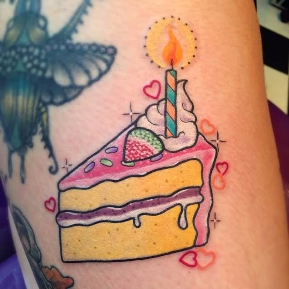 Birthday cake tattoo by Sam Whitehead. #cake #dessert #sweet #delicious #sweettooth #birthday #SamWhitehead