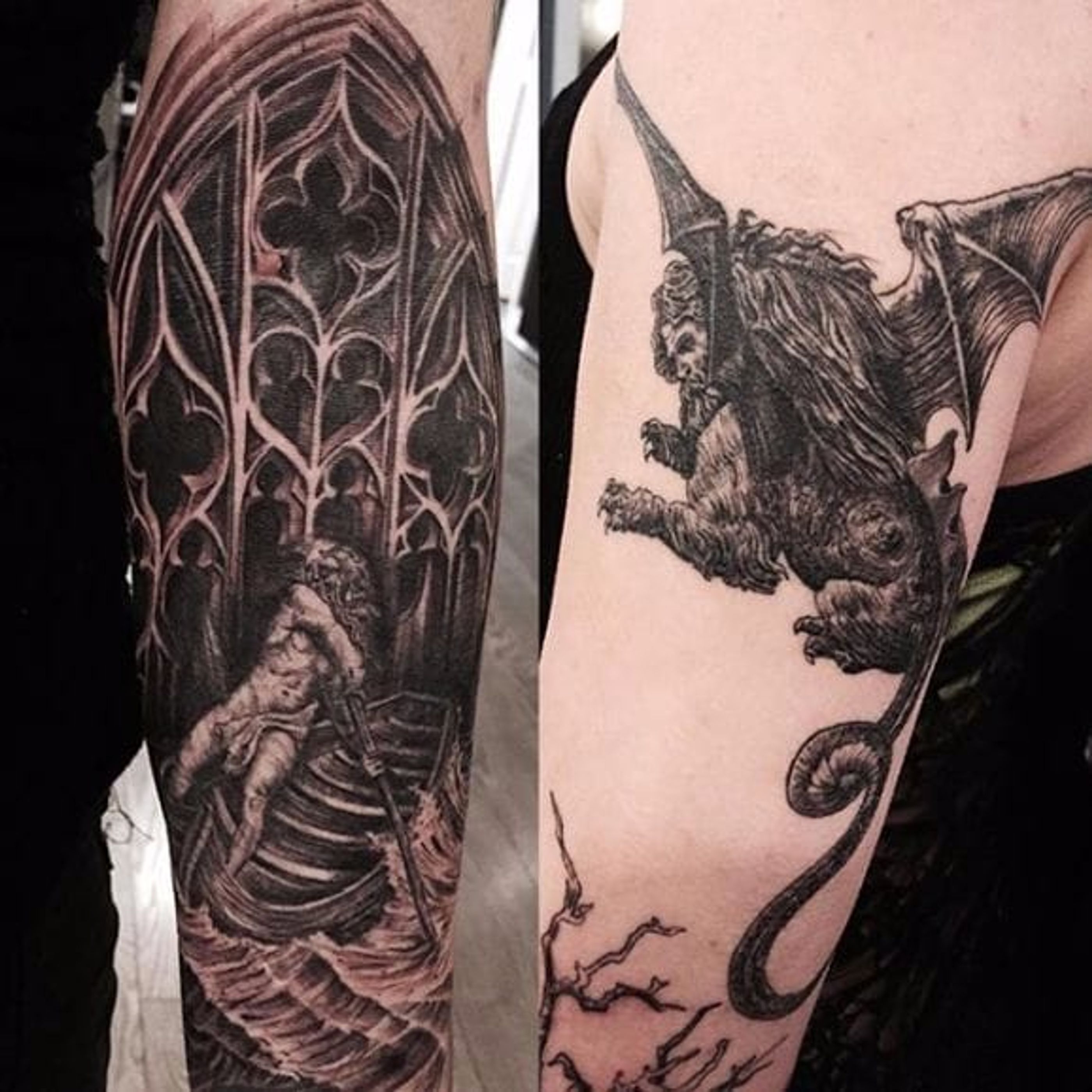 Suter captures the old typography effect for this killer Dante's Inferno inspired sleeve Photo from Luc Suter on Instagram #LucSuter #BlackDiamondTattoo #LosAngeles #blackworker #fineline #realistic #dantesinferno #typography