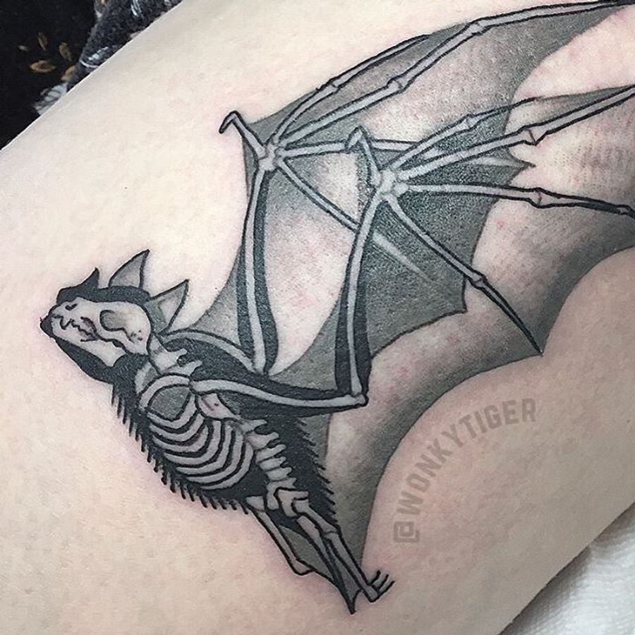 X-Ray Bat Tattoo by Ian Bederman #animaltattoo #traditionalanimal #traditional #quirkytattoos #IanBederman #bat #skeleton #xray