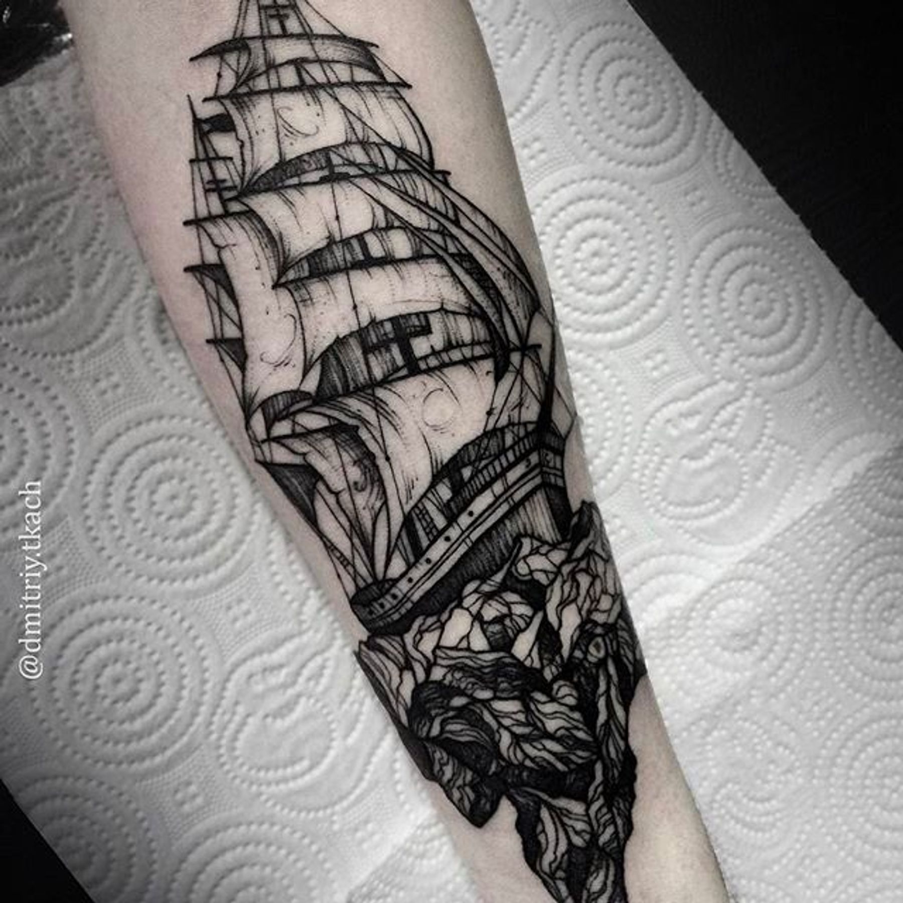 Clean looking galleon tattoo. #DmitriyTkach #blackwork #galleon #ship