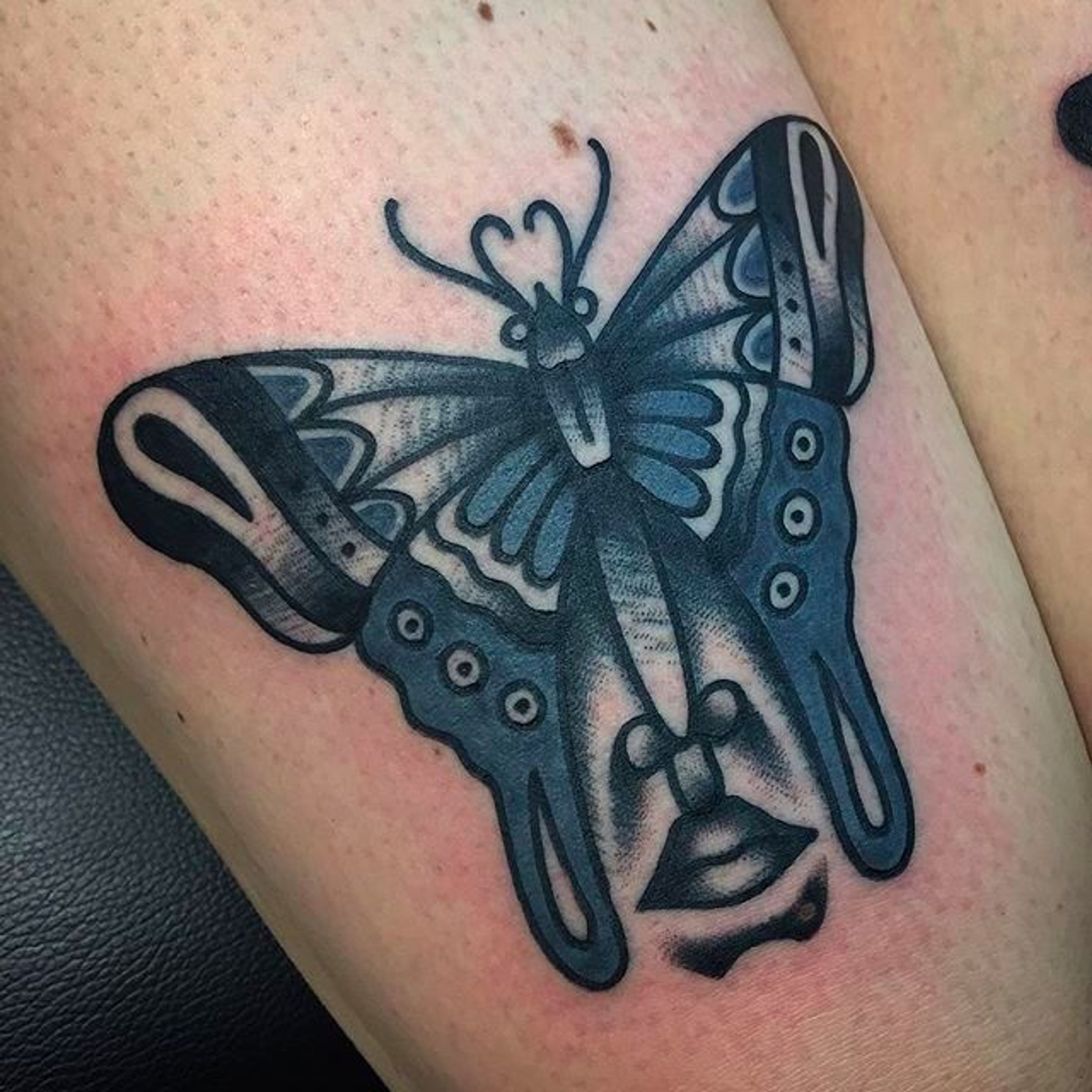 Awesome butterfly masking a face. Crazy tattoo by Rodrigo Garcia Delgadillo. #rodrigogarciadelgadillo #traditionaltattoo #butterfly #face