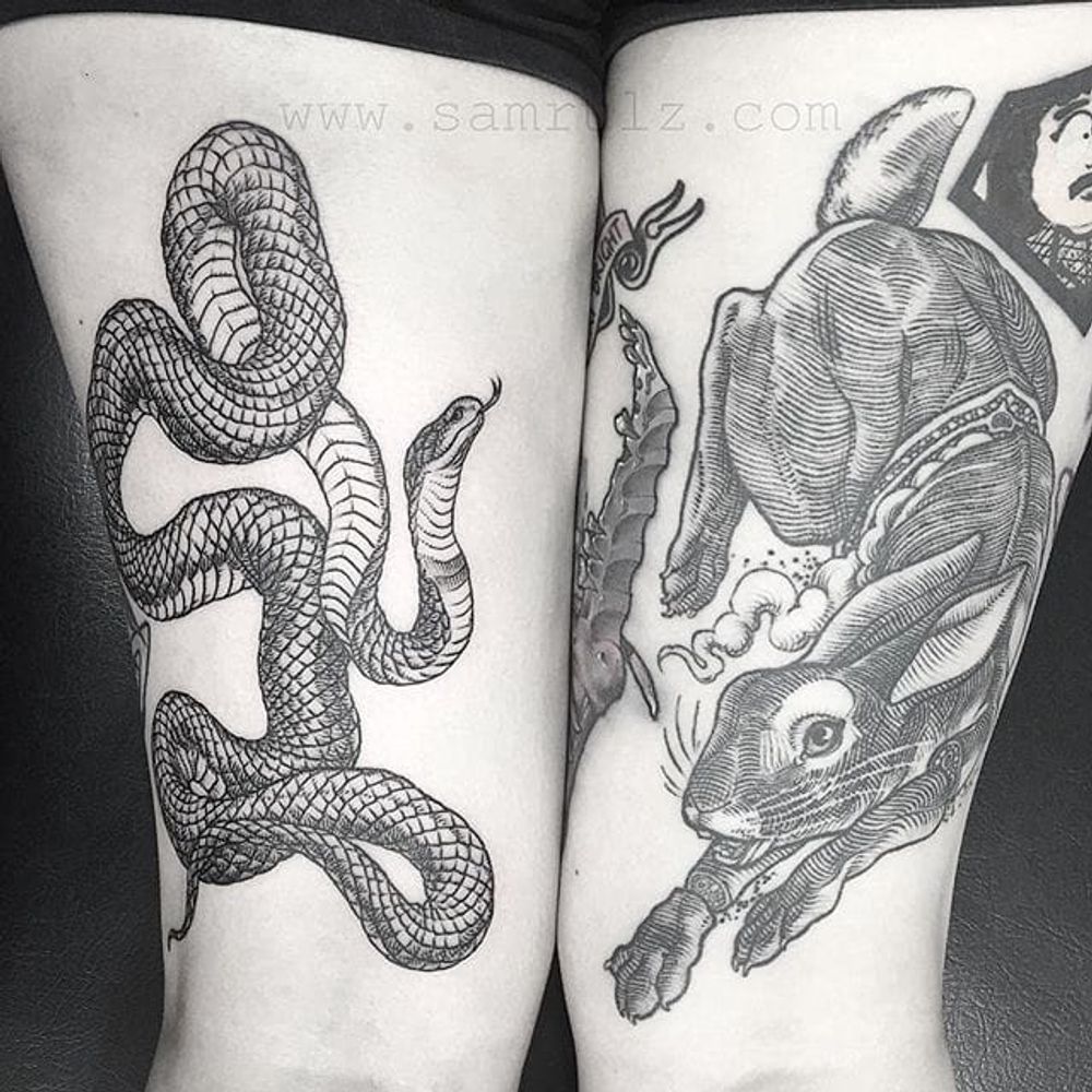 Snake and Rabbit Tattoo by Sam Rulz #IllustrativeTattoos #Illustrative #Etching #Illustration #Blackwork #SamRulz #snake #rabbit