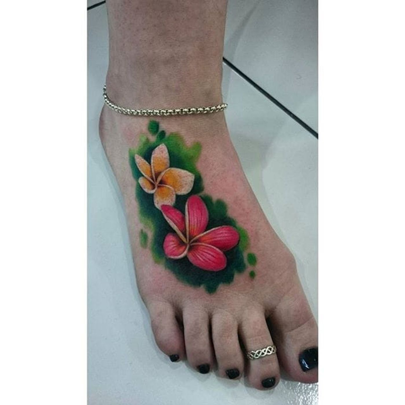 Vibrant Frangipani Foot Tattoo by @paudy_tattoos #frangipani #plumeria #vibrant #color #paudy_tattoos #flower