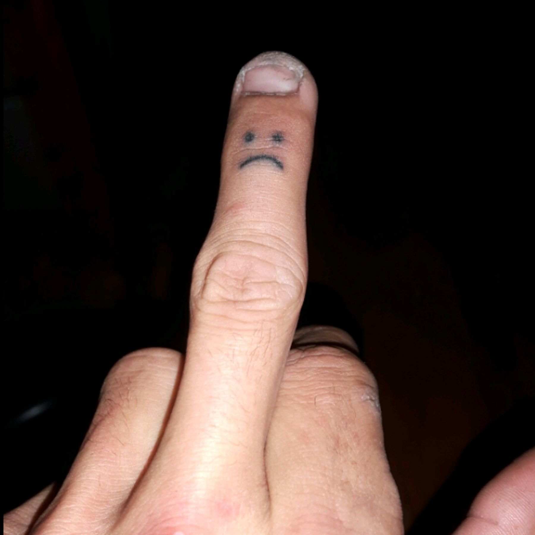 felt like I needed a sad face on my middle finger... getting a happy face on my other one soon :) first tattoo I did on myself ❤❤ #stickandpoke #art #sad #face #middle #finger #tiny