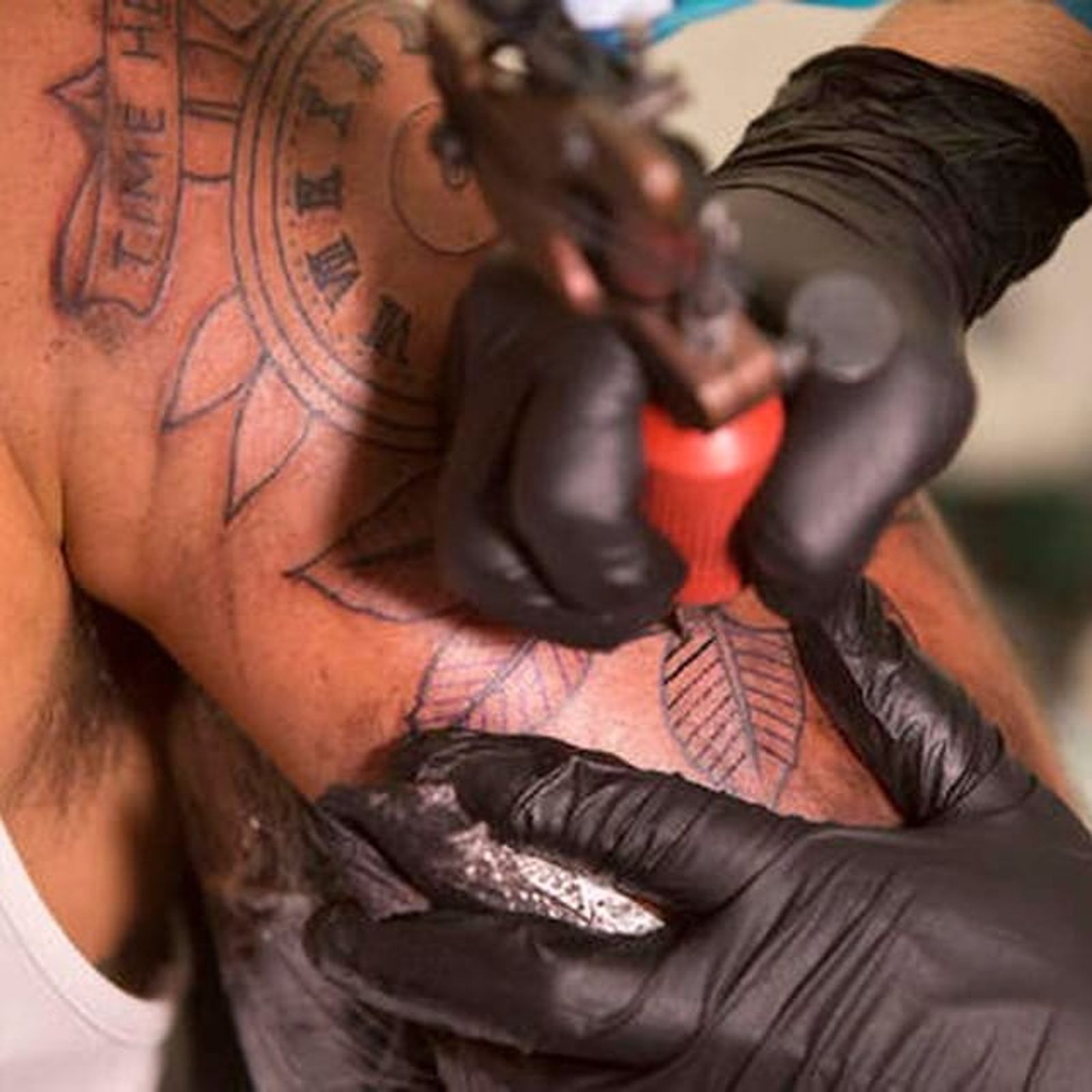 Photo by Sebastian Scheiner of Luke Wessman (IG—lukewessman) tattooing over a war victim's scars in the Israel Museum. #Artists4Israel #IsrealMuseum #LukeWessman #warvictims