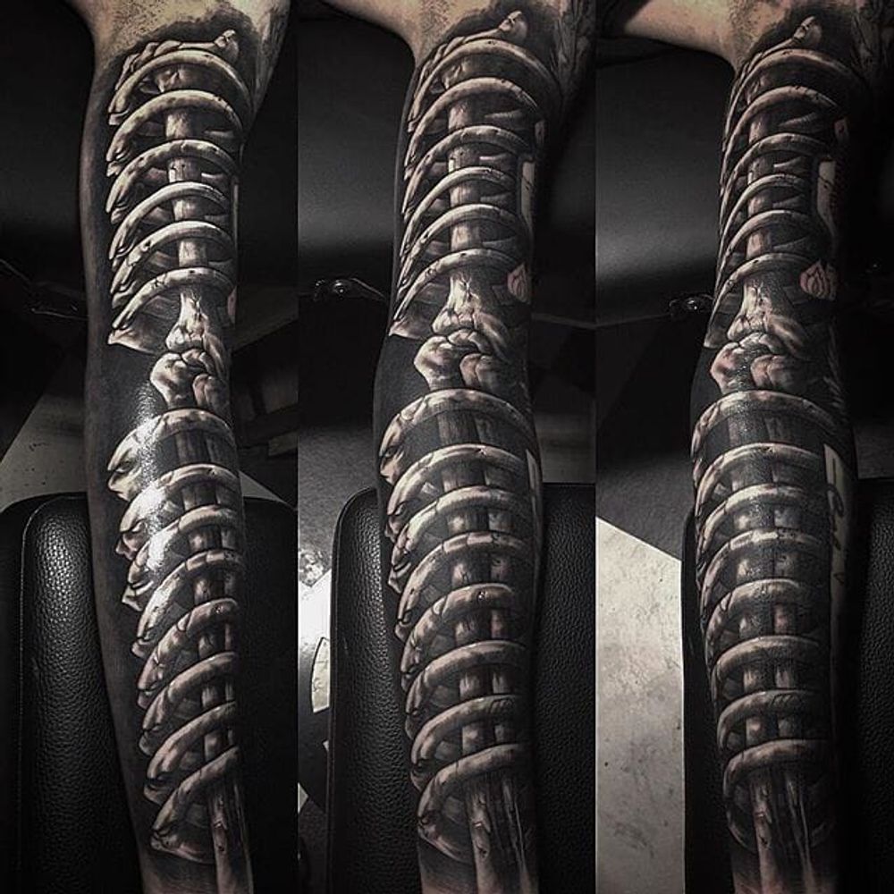 Stunning sleeve tattoo by @Garaskull #skeleton #black #blackwork #xray #sleeve #bones