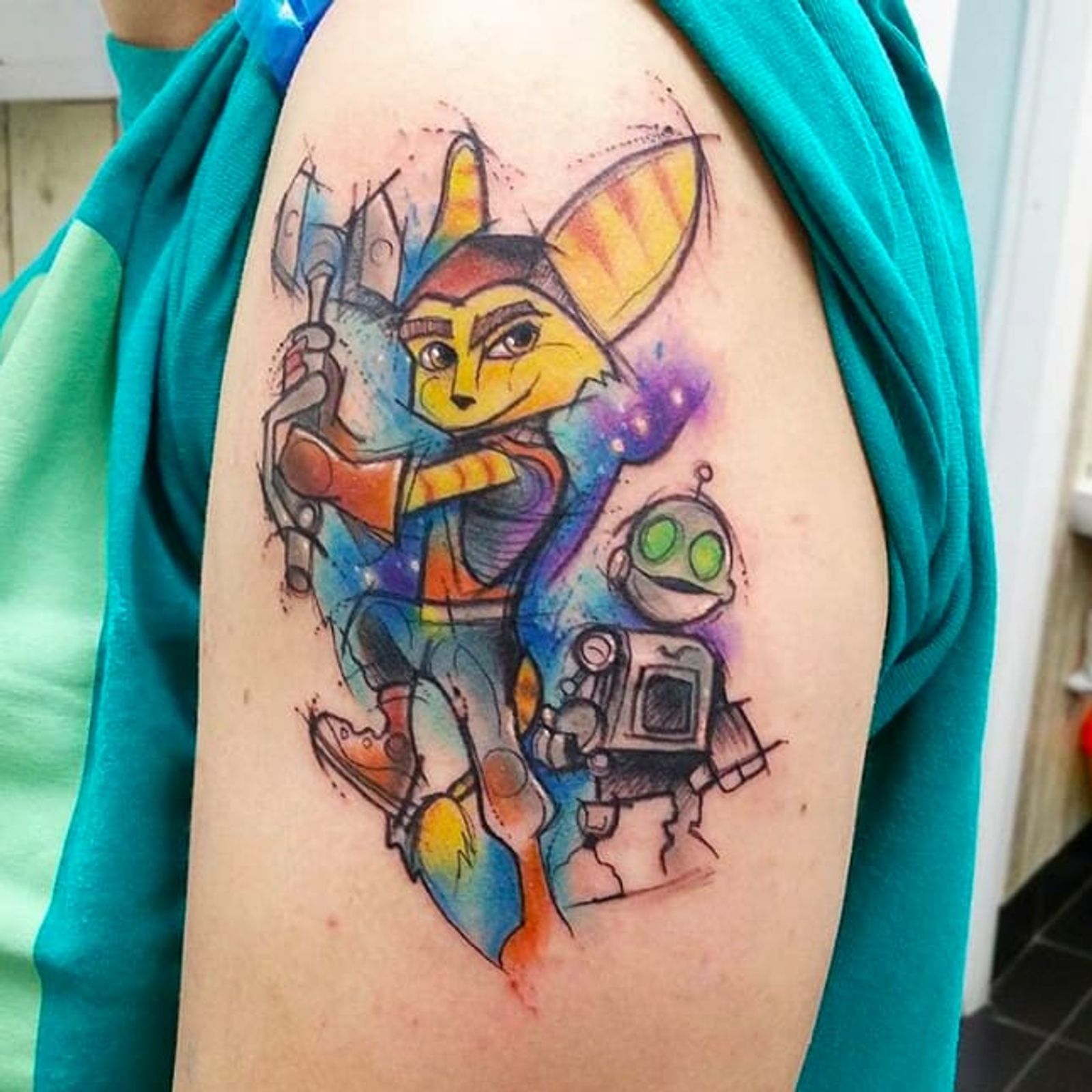 Ratchet and Clank tattoo by Josie Sexton #JosieSexton #ratchetandclank #watercolour #sketch (Photo: IG-josiesexton)