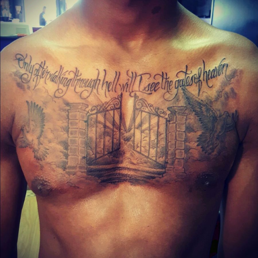 Gates of heaven chest piece that says at the top "Only After Walking Through Hell Will I See The Gates Of Heaven"