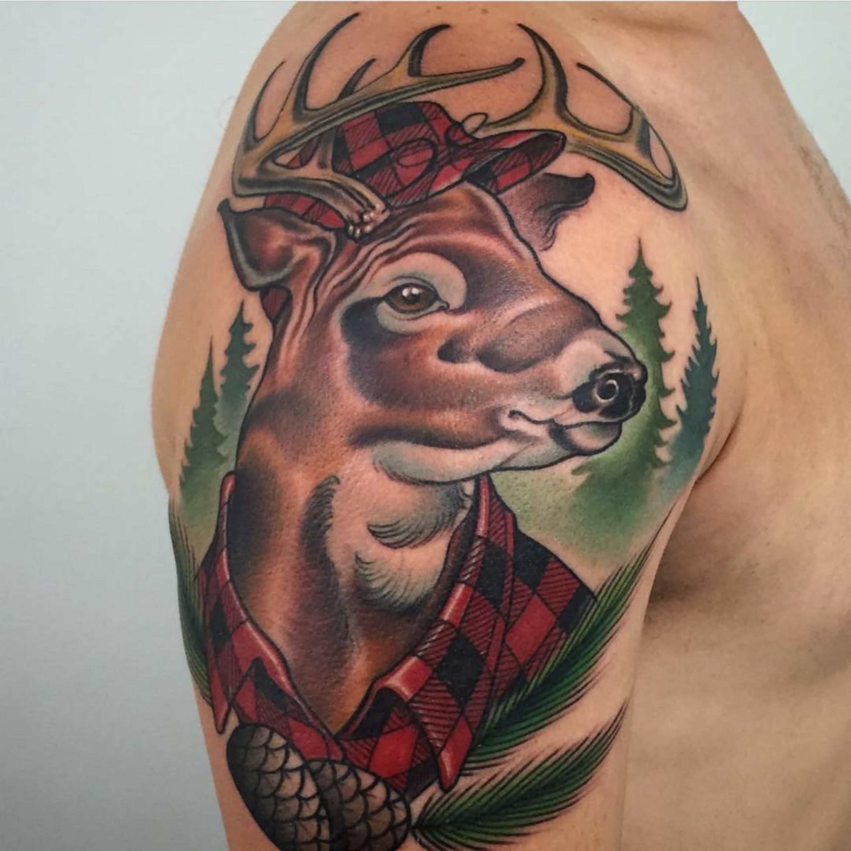 An excellent bust of a buck wearing a Stormy Kromer cap by Dan Pemble (IG—danpemble). #buck #caps #DanPemble #HatsforLife #SacredTattooStudio #StormyKromer