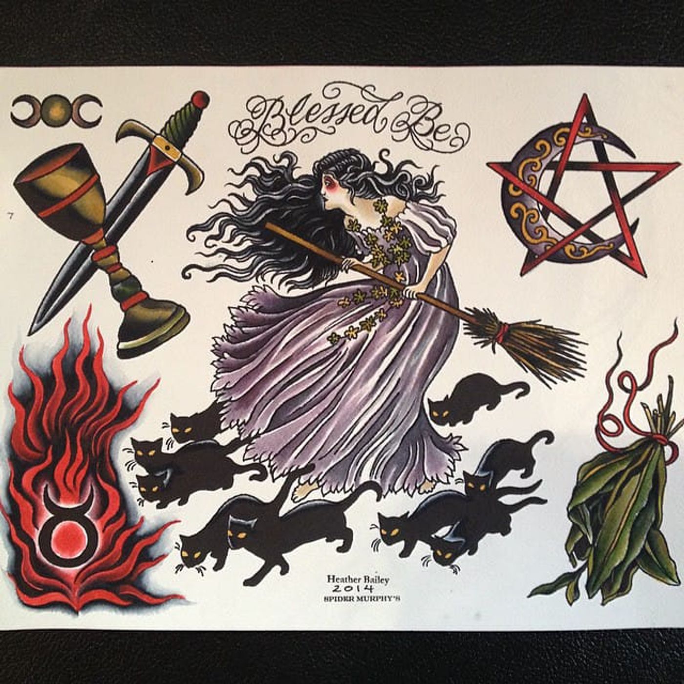Blessed Be by Heather Bailey (via IG-cathedraloftears) #artist #tattooartist #gothic #flashart #fineart #artshare #HeatherBailey #witch #cat #blackcat #hellfire #pentagram #sage