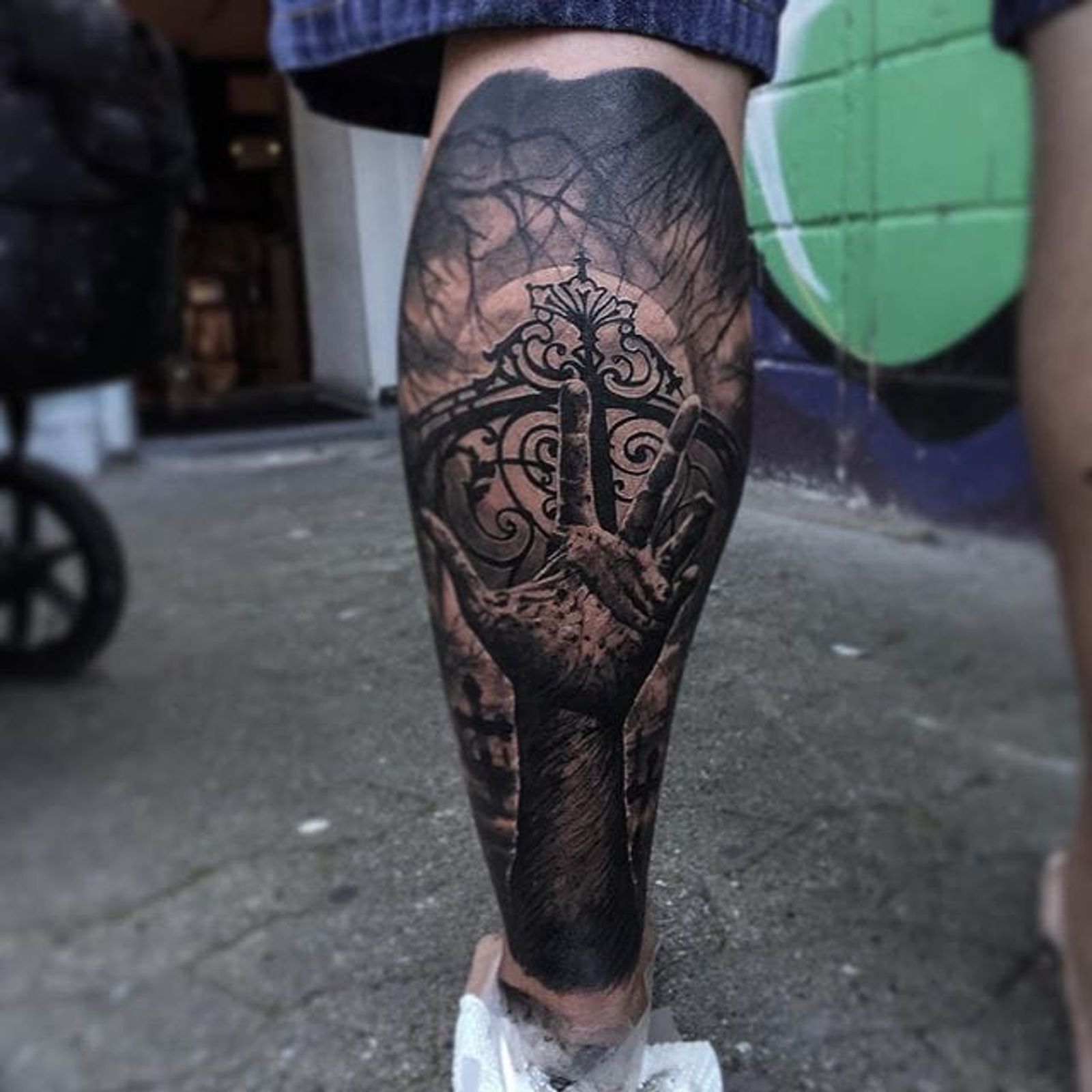Horror inspired black and grey calf piece by Mads Thill. #blackandgrey #realism #horror #creepy #hand #MadsThill