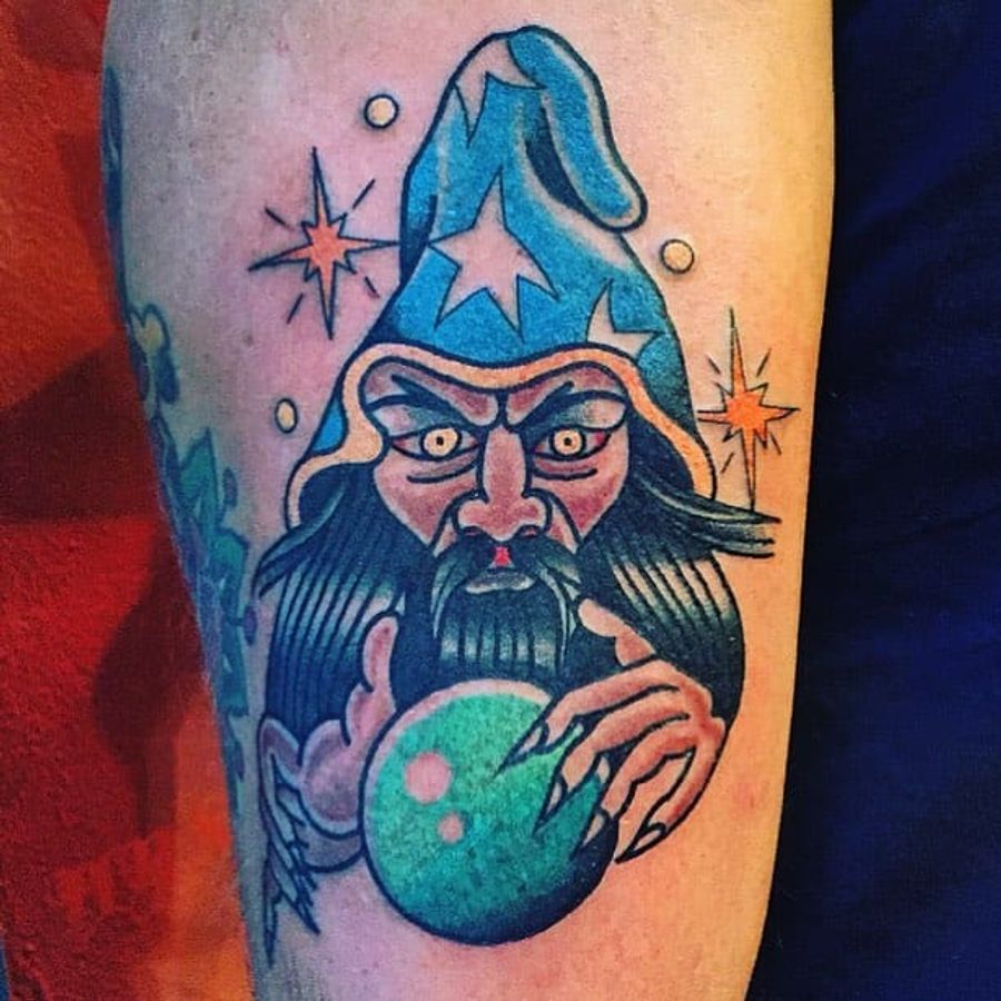 Rad looking wizard tattoo done by Luca Sala. #LucaSala #OldInkTattoo #boldtattoos #solidtattoos #wizard