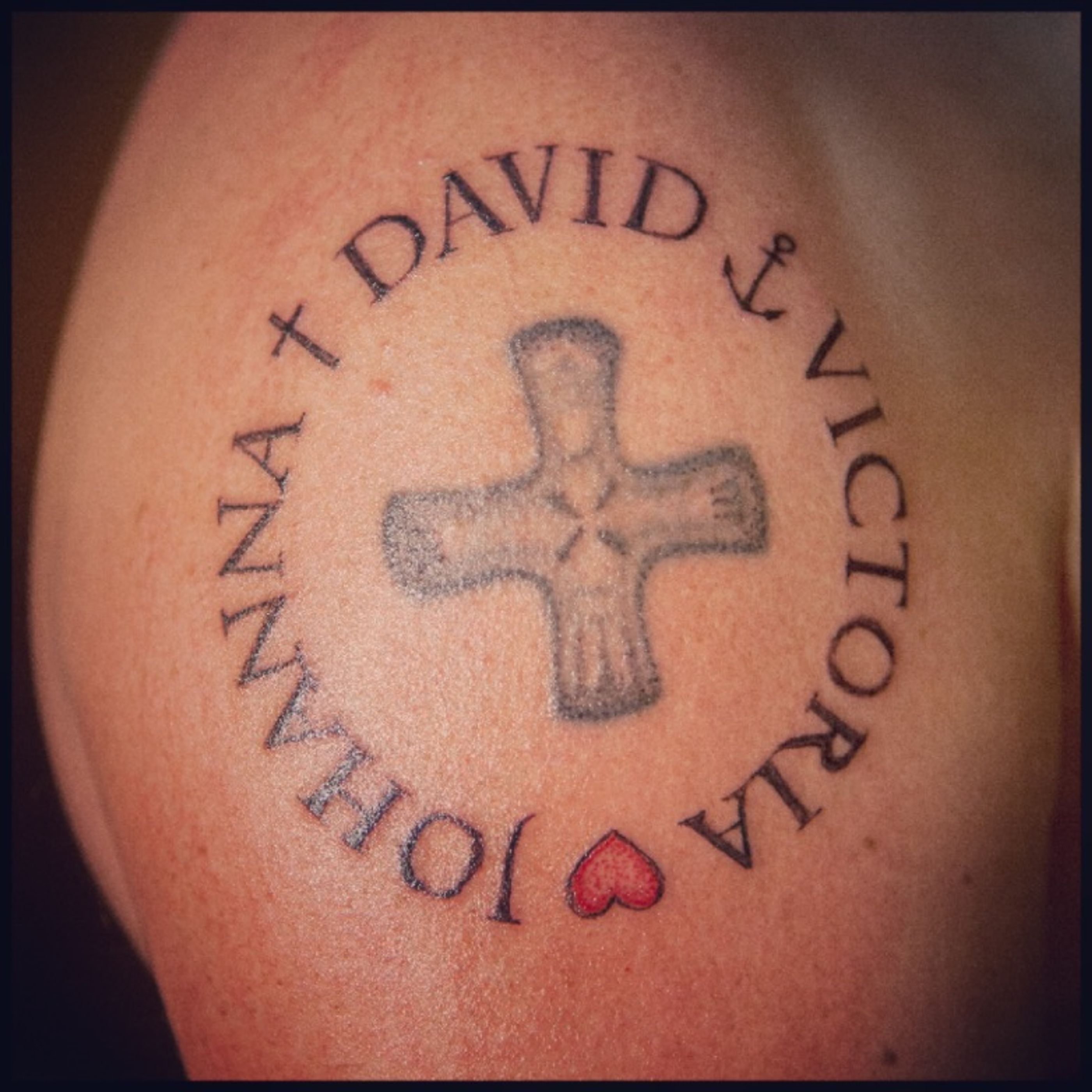 The fourth tattoo that I have done - but the first time with letters, lines ... and red color! The cross in the middle is an old one and not my work - but I did give it a few dots to freshen it up a bit! :) #letters #FaithHopeLove #monoink