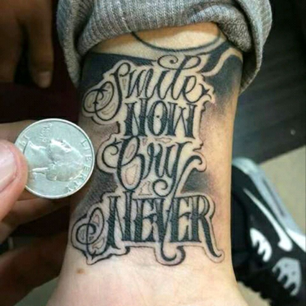 #BogusTattoo #Lettering #Caligraphy #Tiny #BlackandGrey "Smile Now Cry Never"