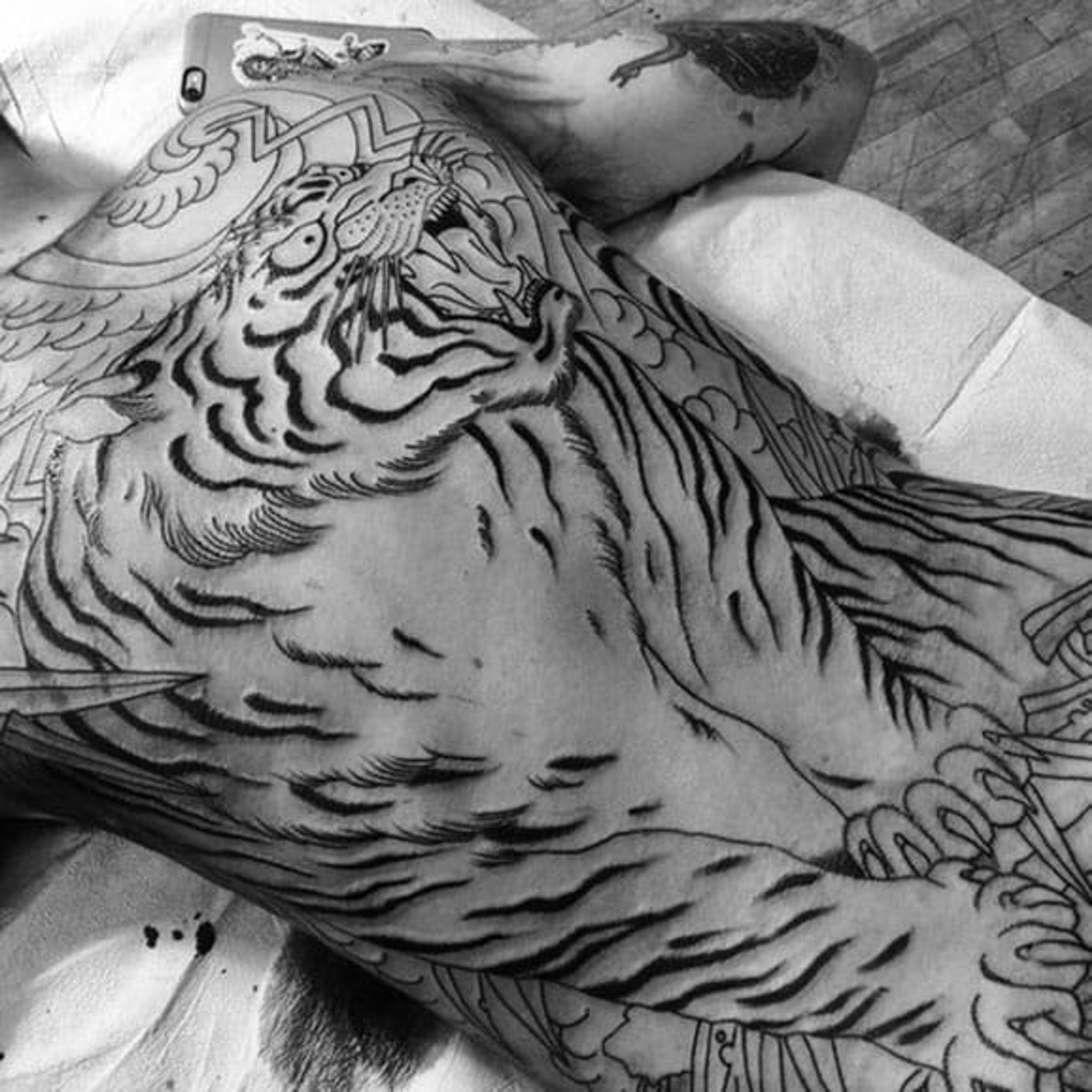 This tiger is going to be epic with color. Tattoo by Chris O'Donnell. #ChrisODonnell #TraditionalJapanese #KingsAvenueTattoo #NewYorkTattooer #oriental #easternculture #tiger #asianart