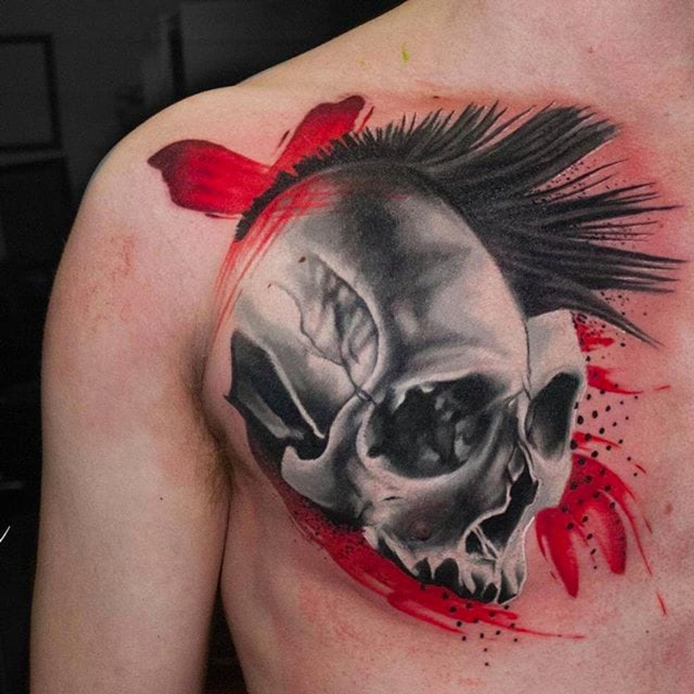 Punk skull tattoo by Michael Cloutier @cloutiermichael #Michaelcloutier #blackandgrey #blackandgray #blackandred #black #red #trashpolka #realism #punk #skull