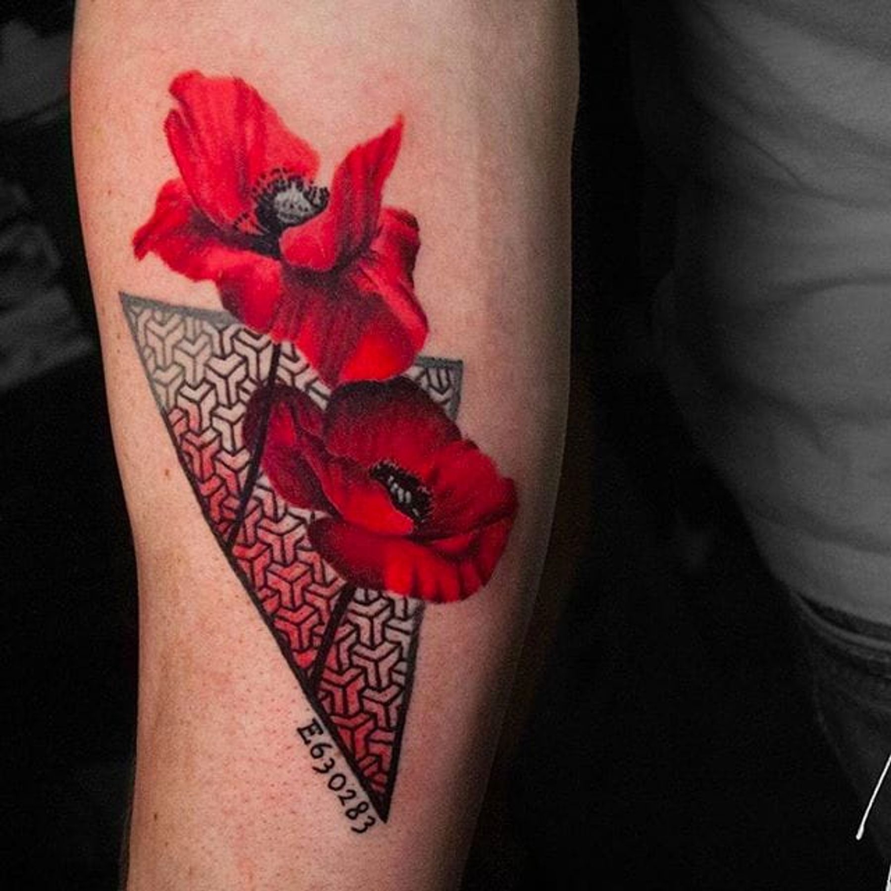 Red flowers geometric tattoo by Michael Cloutier @cloutiermichael #Michaelcloutier #blackandgrey #blackandgray #blackandred #black #red #trashpolka #realism #geometric #red #flowertattoo