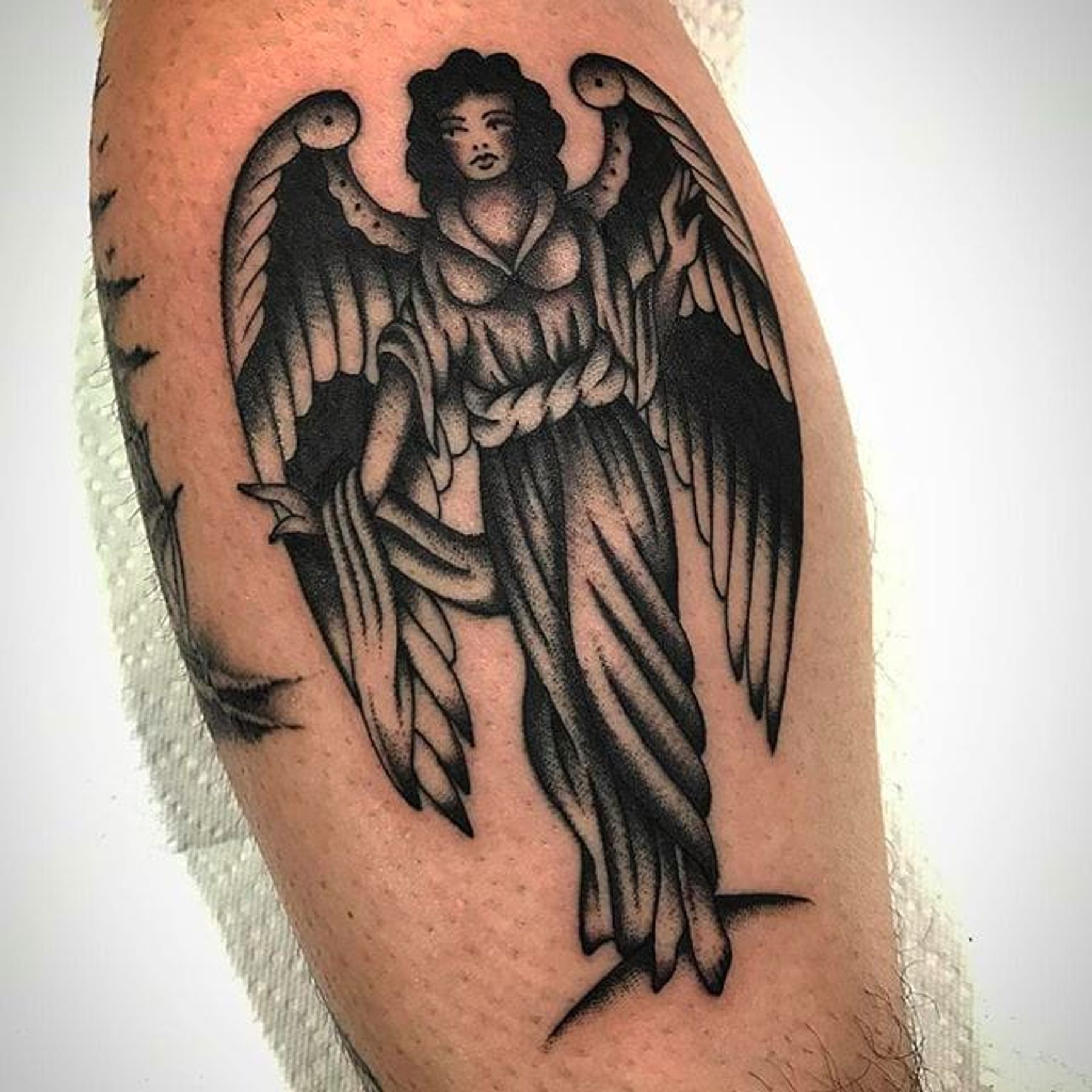 Super clean black work angel tattoo by Bradley Kinney. #bradleykinney #DanaPointTattoo #traditional #bold #angel