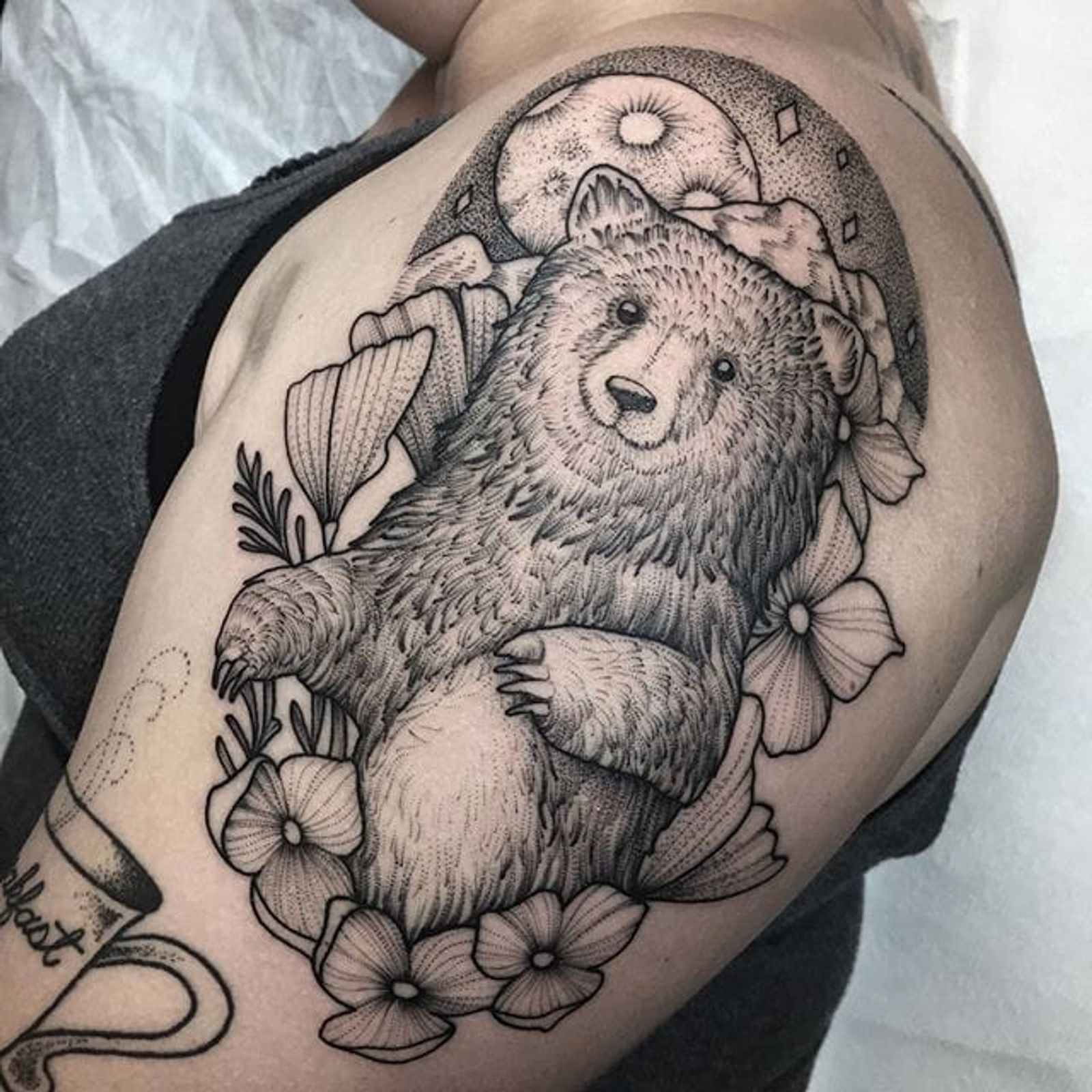 One of Lawrence Edwards's wonderful bear tattoos (IG—feraleyes). #animals #bear #blacktattoo #lawrenceedwards #pointillism
