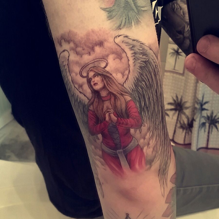 "My Guardian Angel." My Angel will watch over me and protect me. Tattoo done by Adam Lerch of Aggression Tattoo.