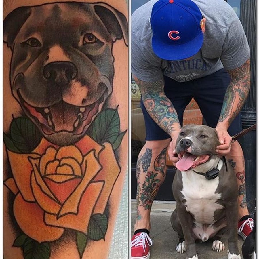 Pit bull and yellow rose tattoo by Nate Corder. #traditional #petportrait #rose #yellowrose #dog #pitbull #NateCorder