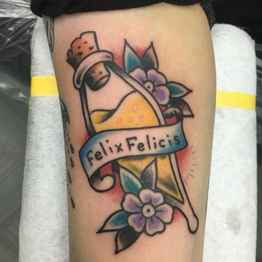 Felix Felicis. Sabe quem fez essa tatuagem? Então conta pra gente! #HarryPotterTattoo #HarryPotter #TatuagemHarryPotter #potion #potiontattoo #harrypotterpotion #felixfelicis