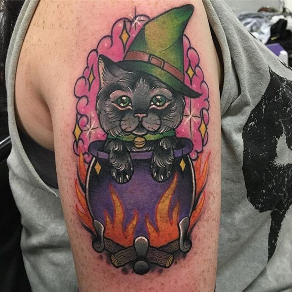 Kitty in a cauldron tattoo by Alex Rowntree. #traditional #neotraditioal #witch #cat #cauldron #AlexRowntree
