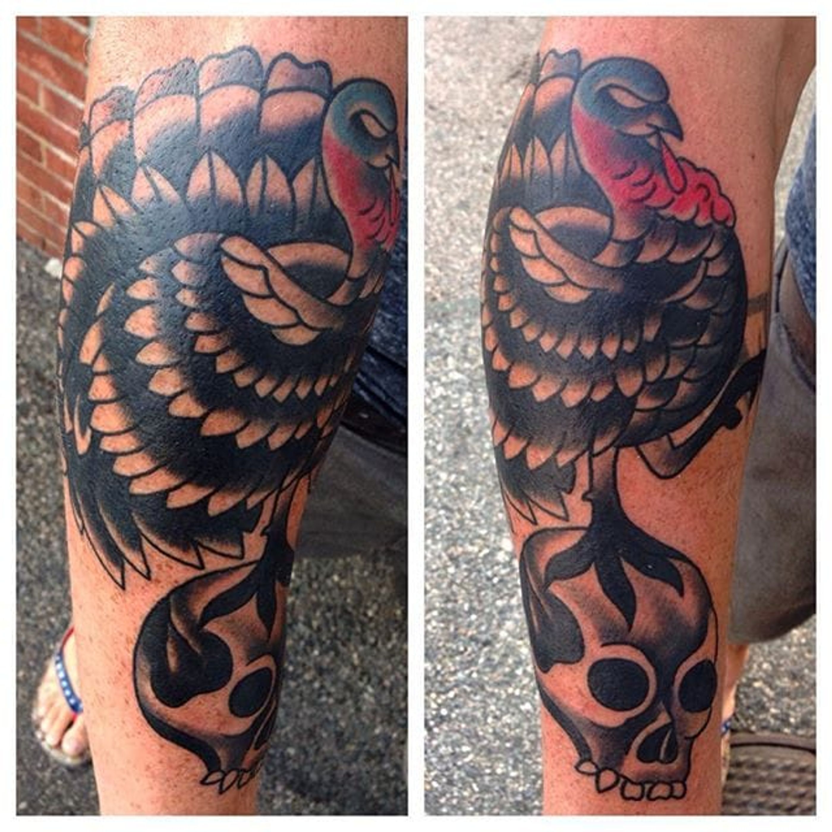Mess with a turkey and it will end with the turkey perched on your skull! Tattoo by Joe Bastek. #traditional #skull #turkey #JoeBastek