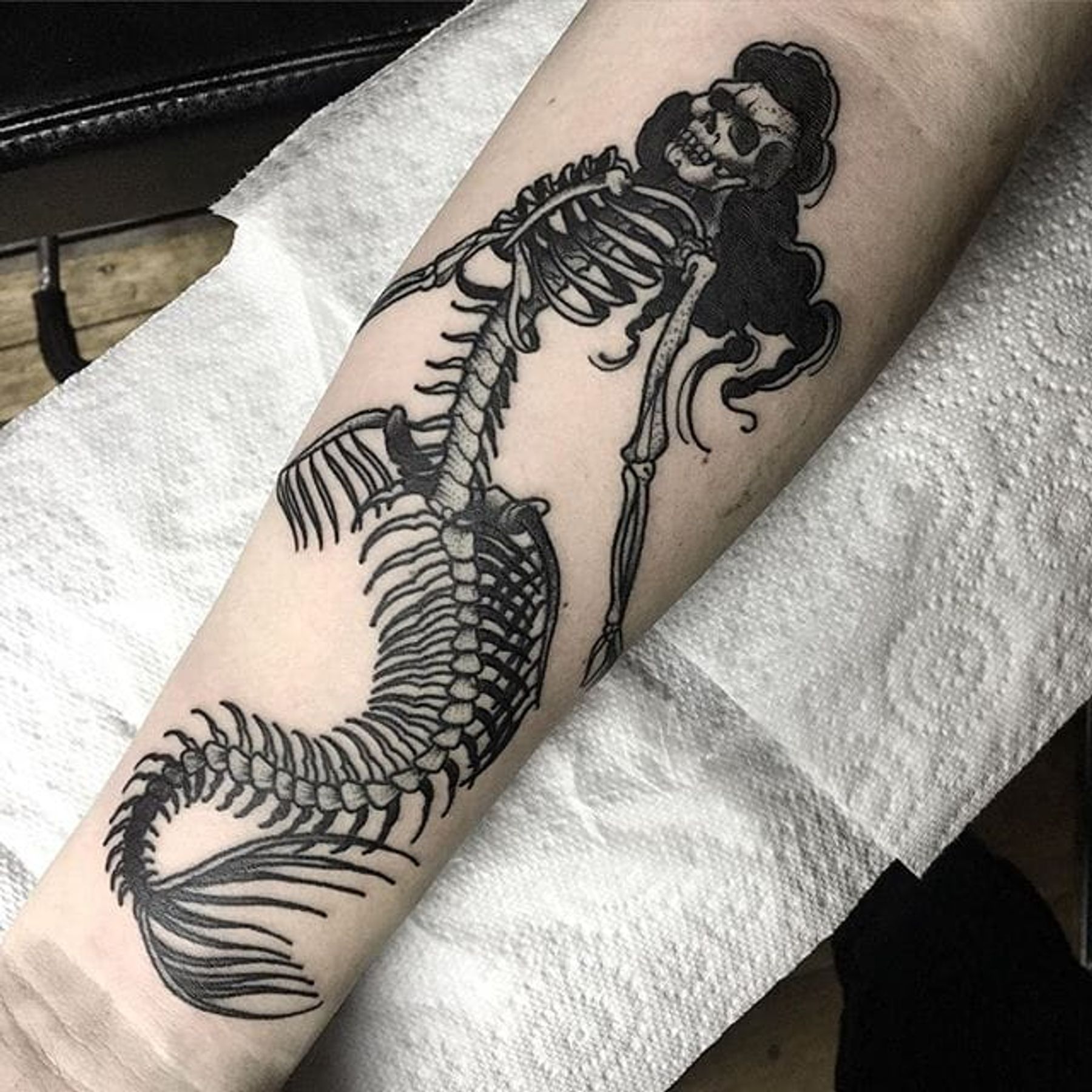 Mermaid Skeleton Tattoo by Aaron Piechocinski #mermaid #skeleton #mermaidskeleton #blackworkmermaid #blackwork #blackink #darkart #AaronPiechocinski