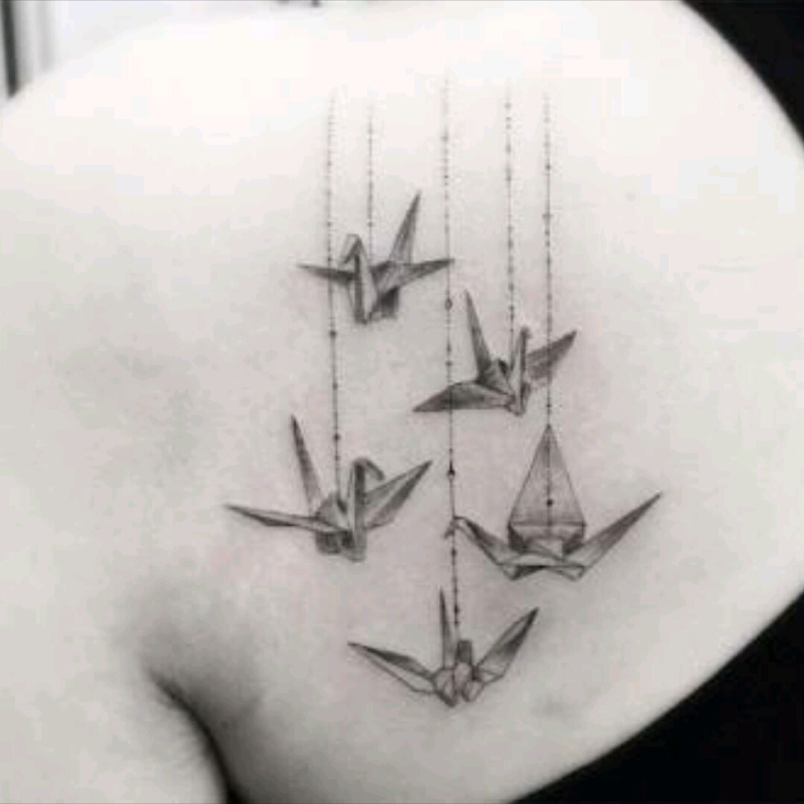 #tattoo #design #tattoodesign #paper #bird #birds #strings #puppet #family #black #blackink #origami #five Origami birds on strings like puppets, awesome tattoo by an unknown artist. ☺