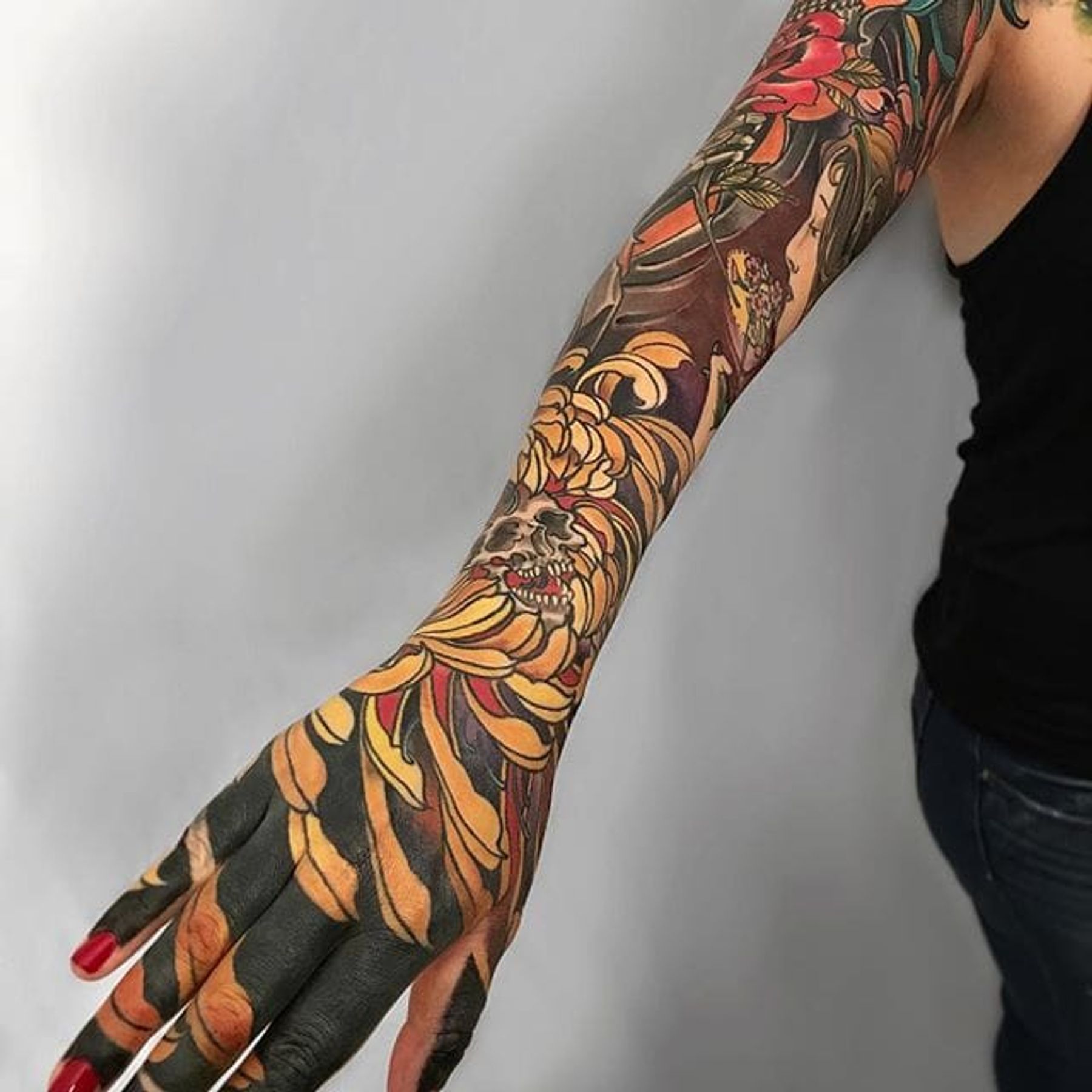 Neo traditional Japanese chrysanthemum tattoo by Fibs. #Fibs #JuvelVasquez #japanese #neotraditional #chrysanthemum #skull #sleeve