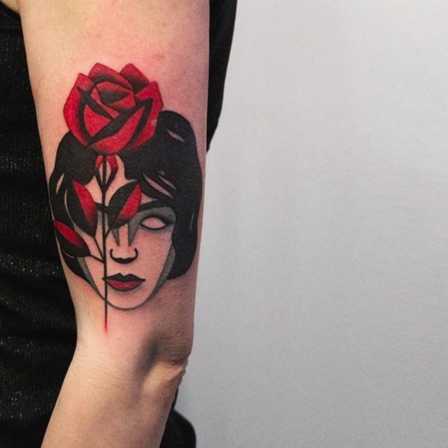 Rose and woman's face tattoo by @maradentattoo #maradentattoo #black #red #blackandredtattoo #oddtattoos #rose