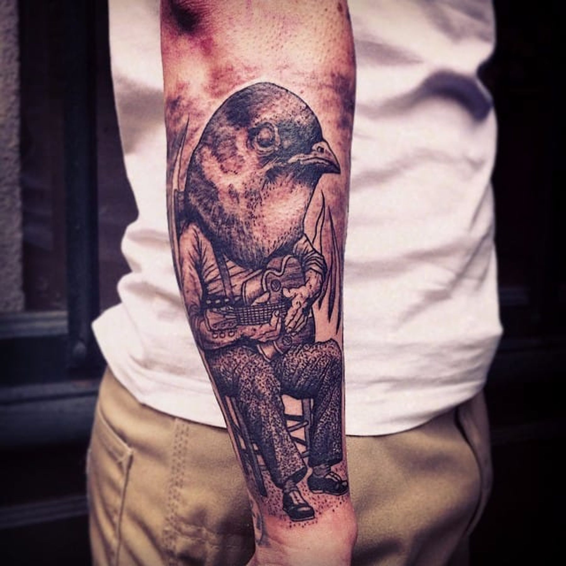 Bird head tattoo by Jean-Luc Navette. #JeanLucNavette #blackwork #vintage #gothic #horror #dark #macabre #bird #guitar #man