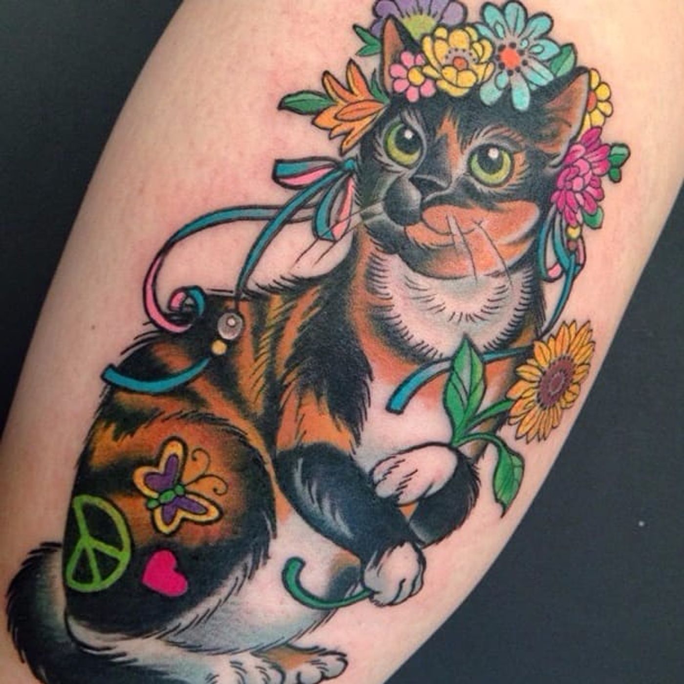 Hippie cat by Kim Saigh. #peace #peacesymbol #hippie #cat #flowers #neotraditional #KimSaigh