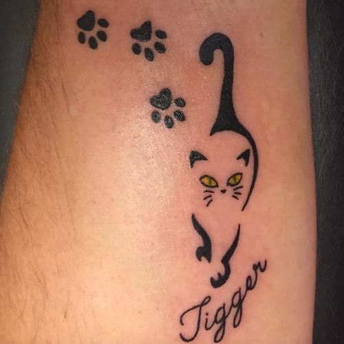 Memorial kitty tattoo with paw prints by Rebecca Fedun #luckycat #longislandtattooshop #longislandtattooartist #cat #lettering #memorialtattoo #pawprint #rebeccafedun #blackwork
