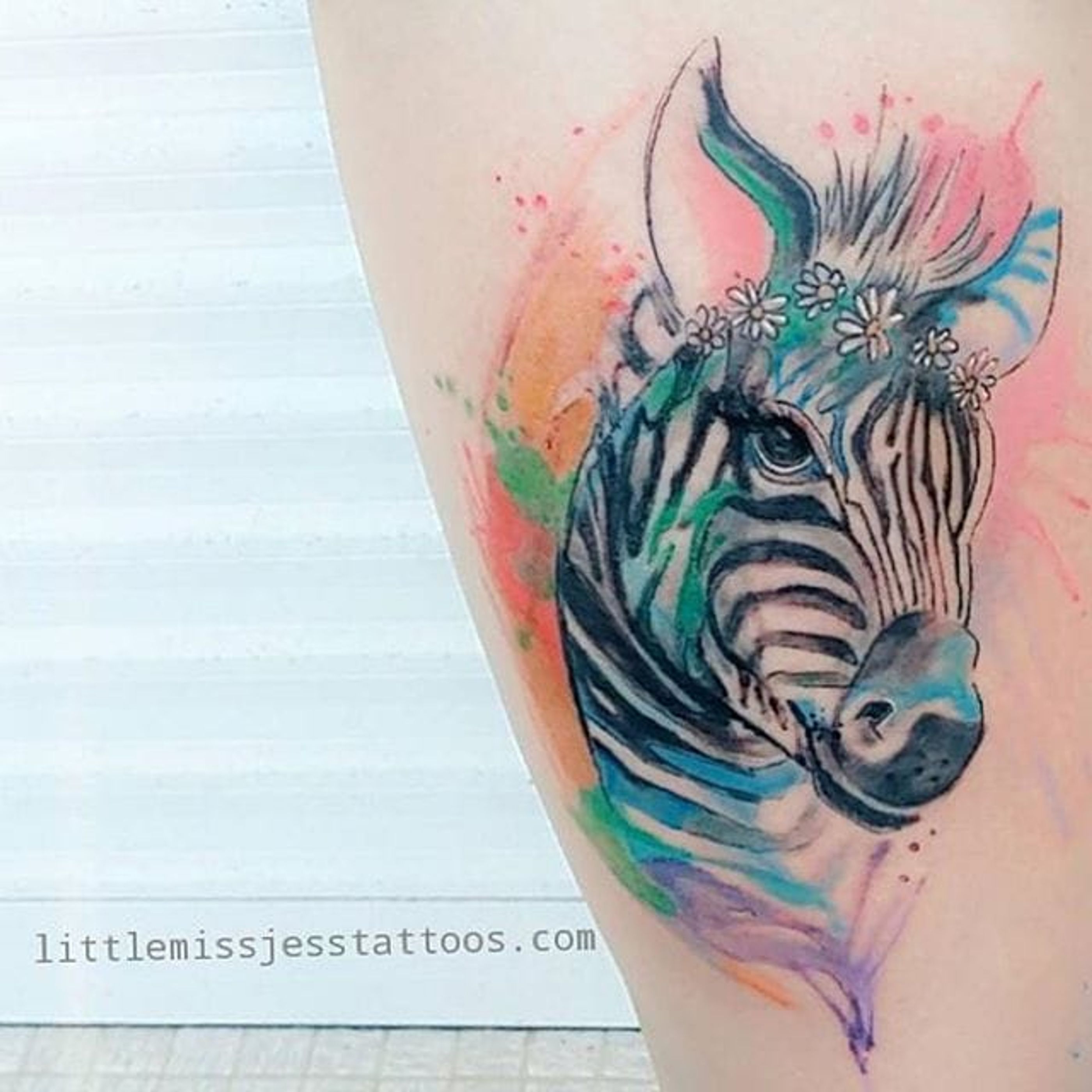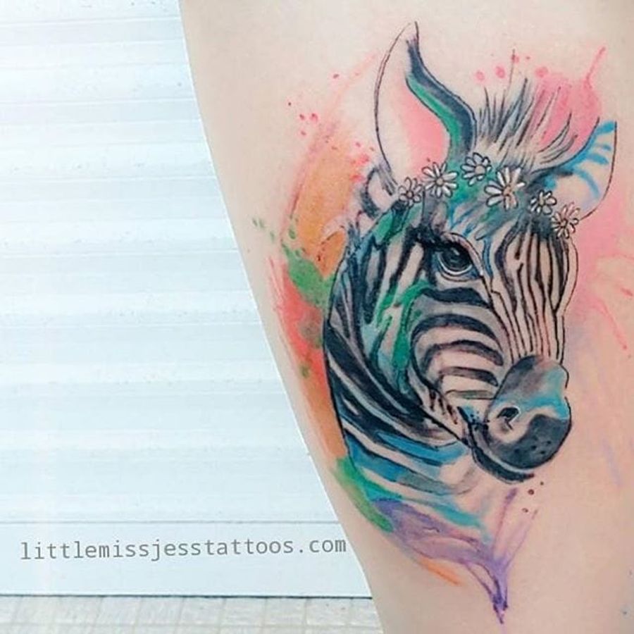 Ink splash watercolor zebra tatttoo by Jess Hannigan. #zebra #watercolor #inksplatter #inksplash #flowers #JessHannigan