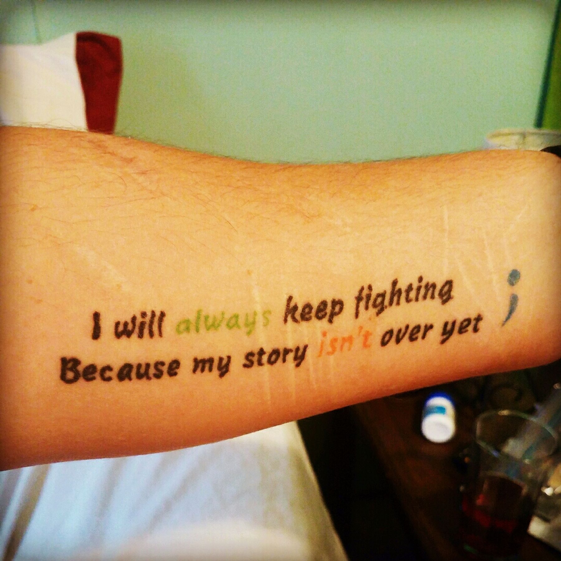 I've had depression for a while and I also used drugs pretty heavily. I've been clean for 2 and a half yrs and I haven't self harmed in 6 months so this tattoo means a lot to me. The colors represent self harm, addiction, and suicide awareness. The semi colon represents where I could have ended my life but I didn't. I chose to fight for myself.