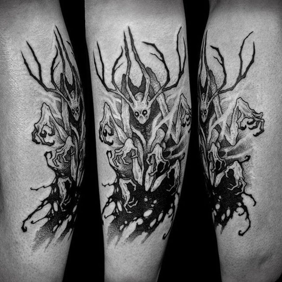 Tree-like monster tattoo by Sergei Titukh. #SergeiTitukh #blackwork #creepy #nightmare #creature #spooky #dark #monster