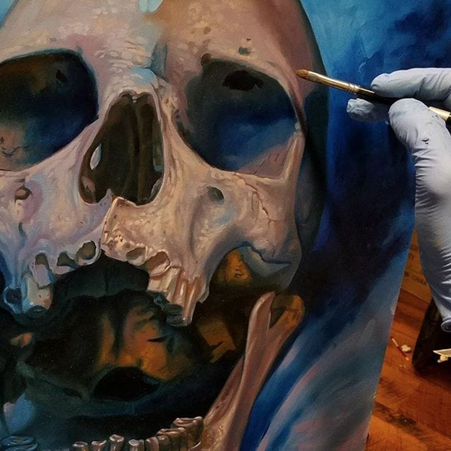 One of Christian Perez's oil paintings of a skull in progress (IG—christian1perez). #ChristianPerez #fineart #oilpaintings #skulls