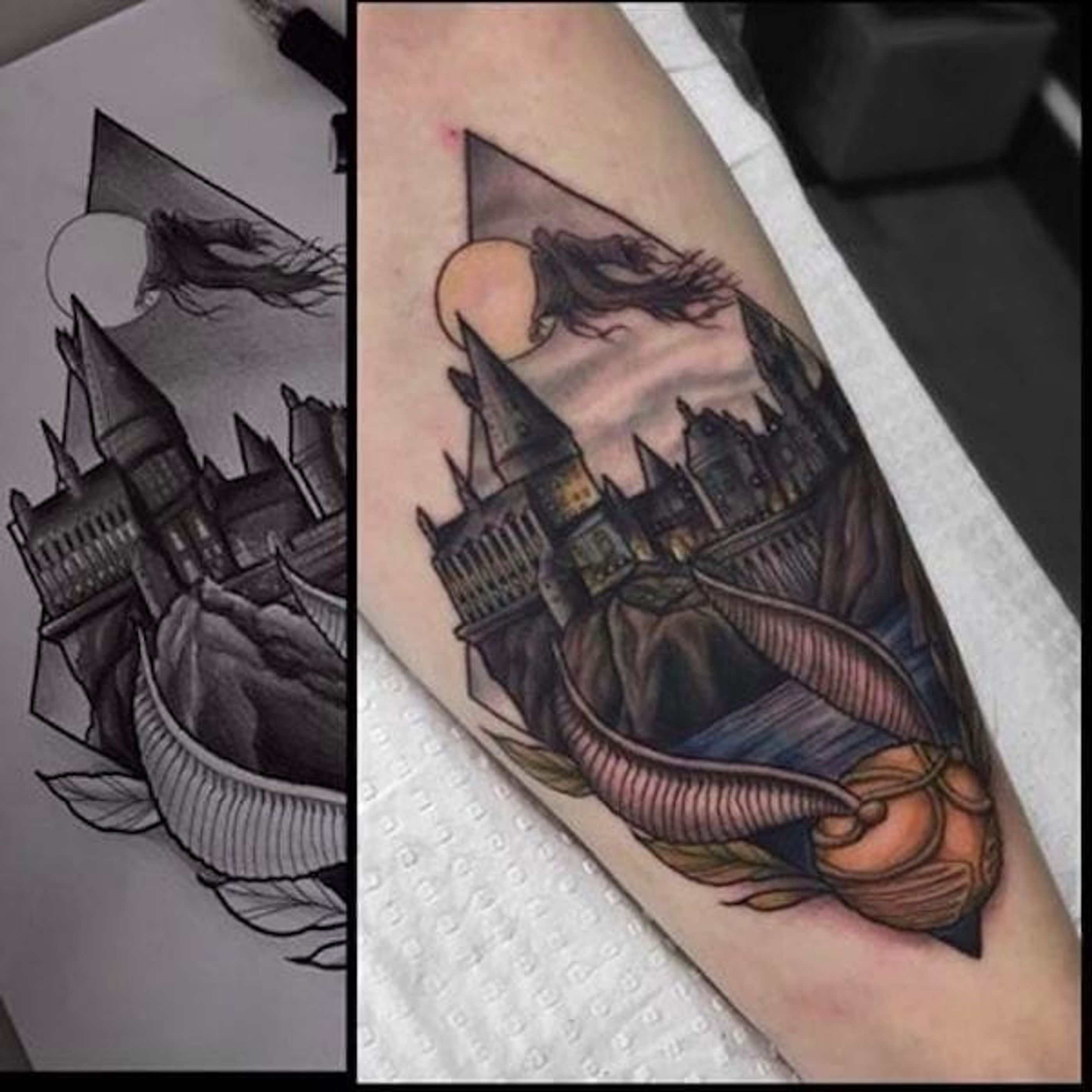Por Jayden Brisbane! #JaydenBrisbane #Hogwarts #hogwartscastle #HarryPotter #HarryPotterTattoo #goldensnitch #Hogwartstattoo