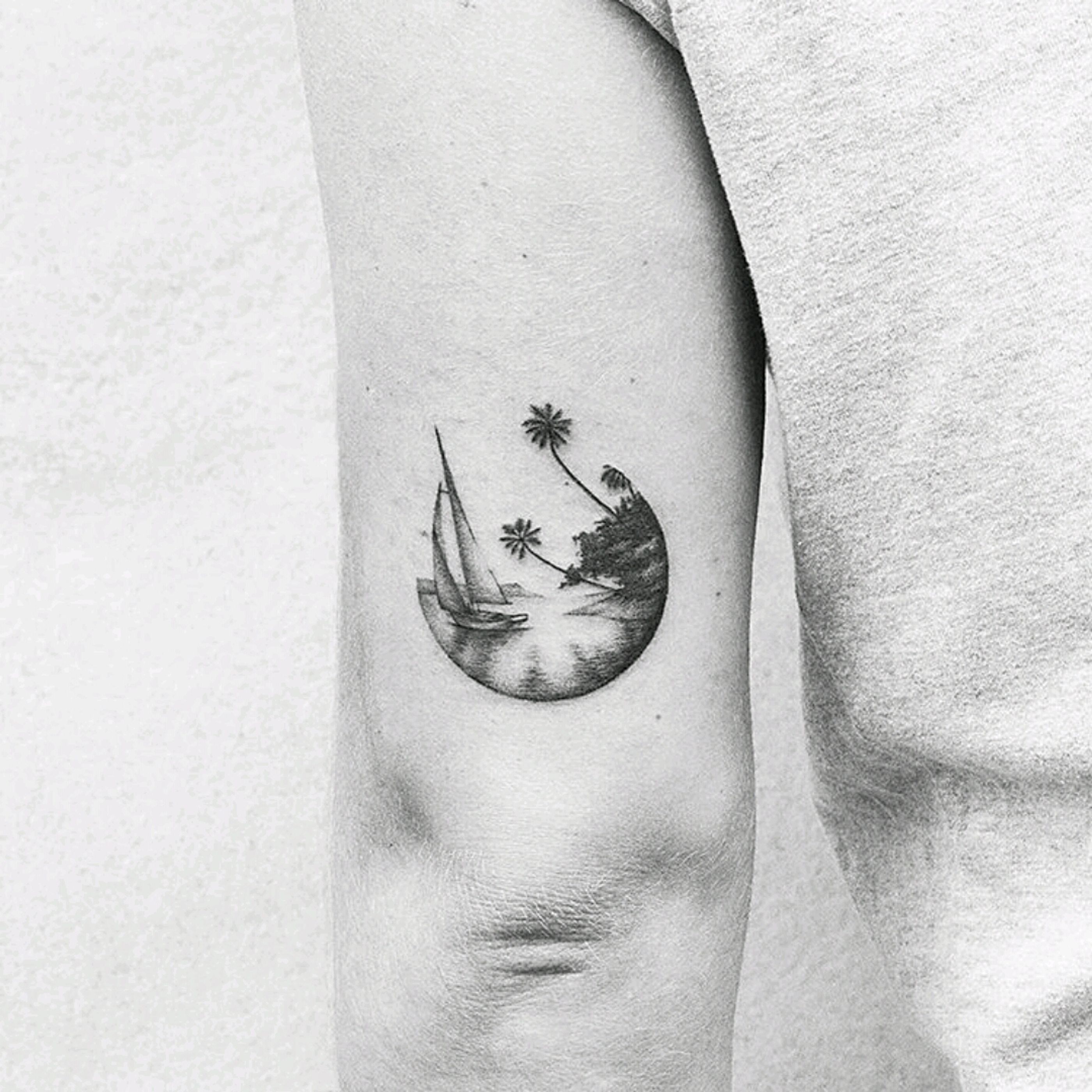 By #amanda_piejak #beach #palmtree #ocean #boat #arm #beachtattoo