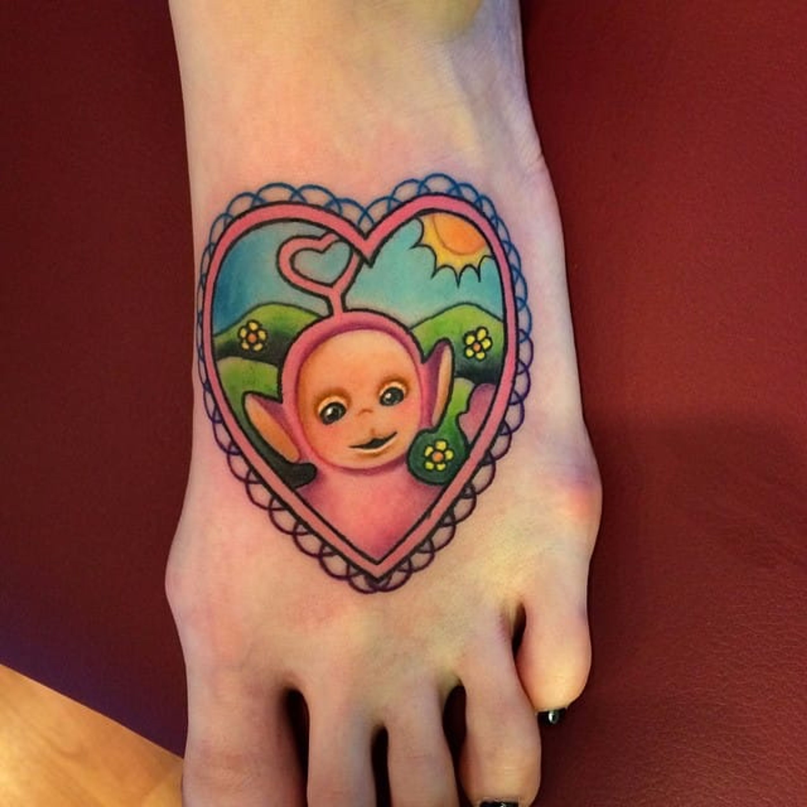Teletubby tattoo by Melvin Arizmendi. #MelvinArizmendi #kawaii #cute #girly #popculture #pinkwork #teletubby