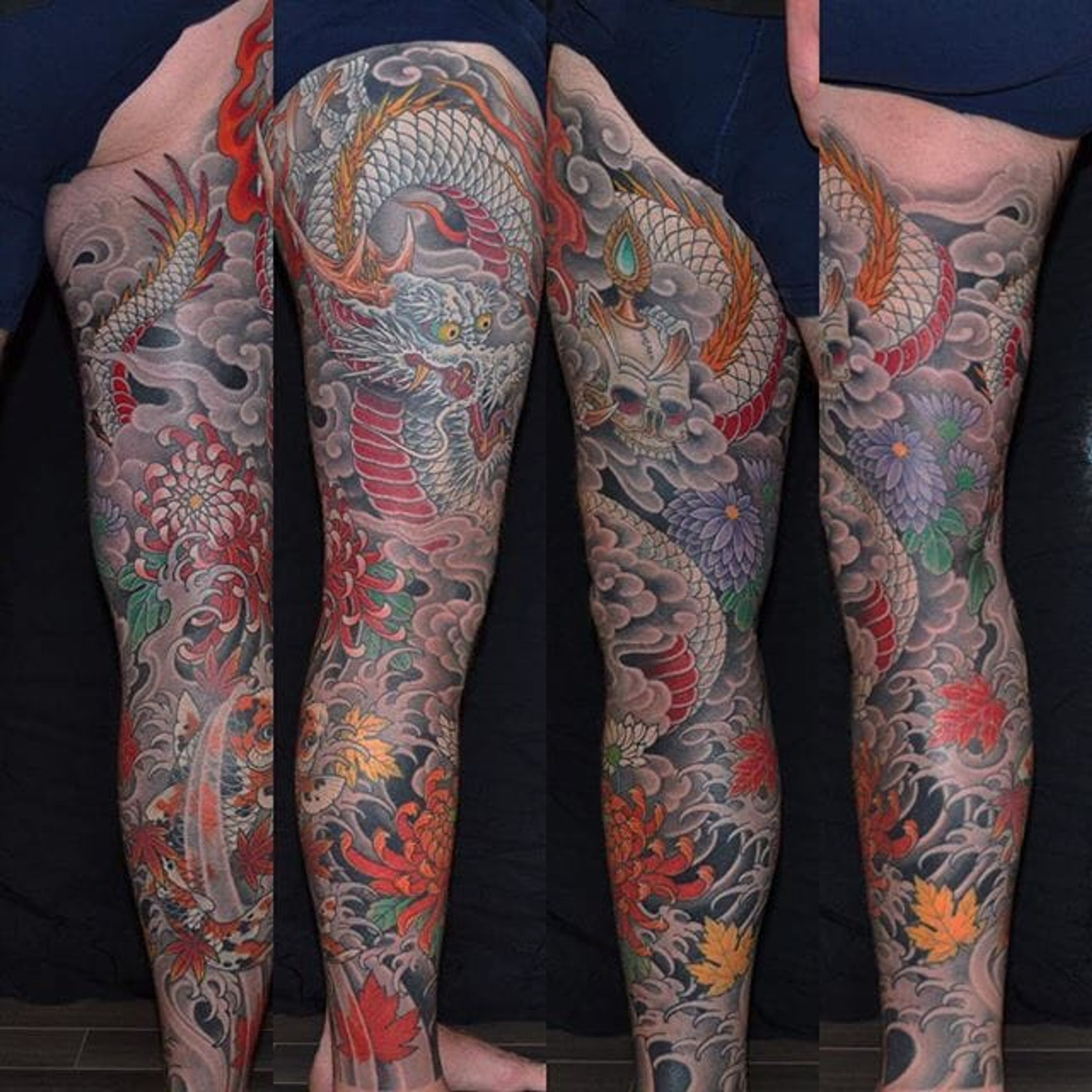 An astounding leg sleeve via Chris Garver (IG—chrisgarver). #dragon #Irezumi #Japanese #traditional #sleeves