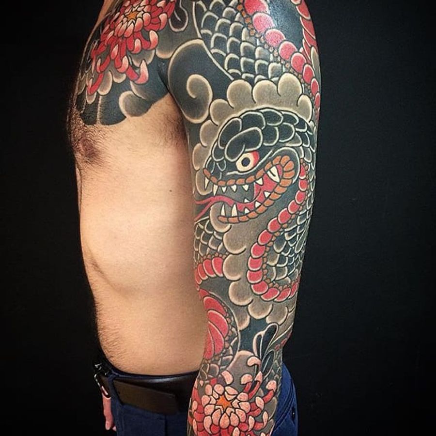 A bold Irezumi snake by Kiku (IG—kikupunk). #Irezumi #Japanese #traditional #sleeves #snake