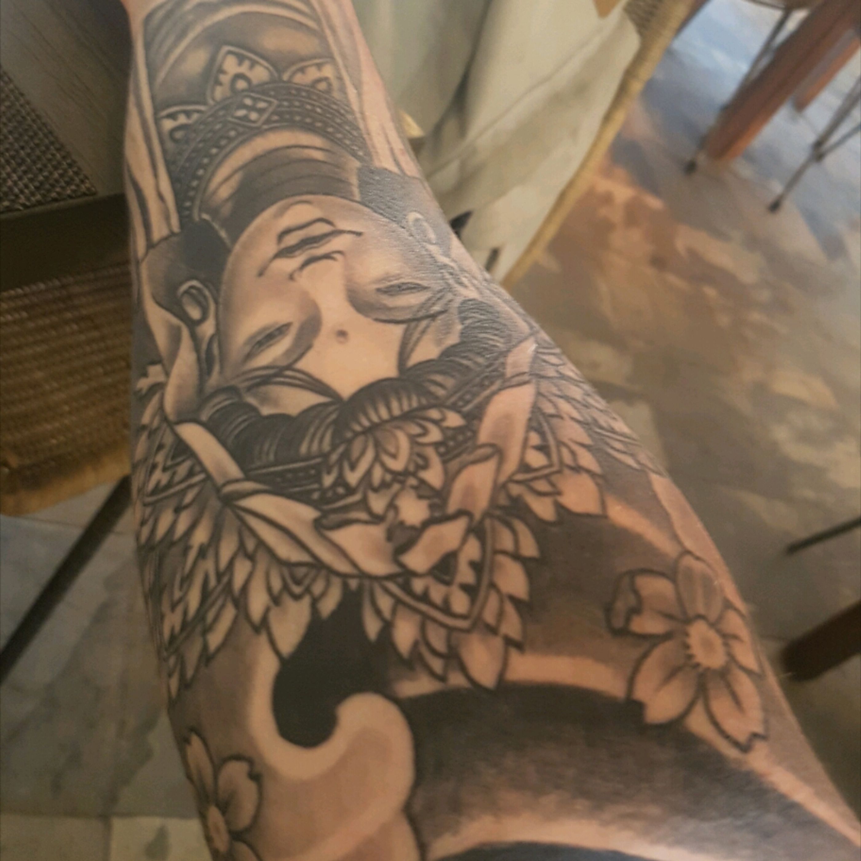 Buddha tattooo. Completed by adam at aussine tattoo studio patong, thailand. #Oriental #japanesetattoo #japanese #buddha #buddhatattoo #blackandgreytattoo