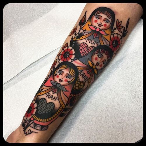 Stacking Dolls by Leonie New (via IG-leonienewtattoos) #leonienew #traditional #color #girly #pretty #ChapelTattoo