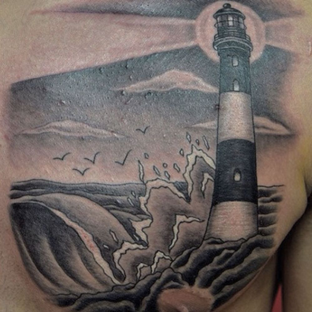 Fire Island lighthouse tattoo by Tara #fireisland #lighthouse #longisland #lighthousetattoo #chest #islandlife #tattootara #blackandgrey #bodydesigns